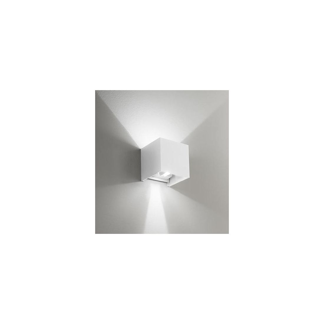 Un piccolo cubo biemissione con sorgente luminosa integrata a led da 10w totali con una luce, a scelta, tra bianca calda 3000k oppure bianca naturale 4000k che crea stupefacenti fasci conici di luce sulle pareti con diversa gradazione regolabile; il modulo Led e il trasformatore sono inclusi nella confezione.