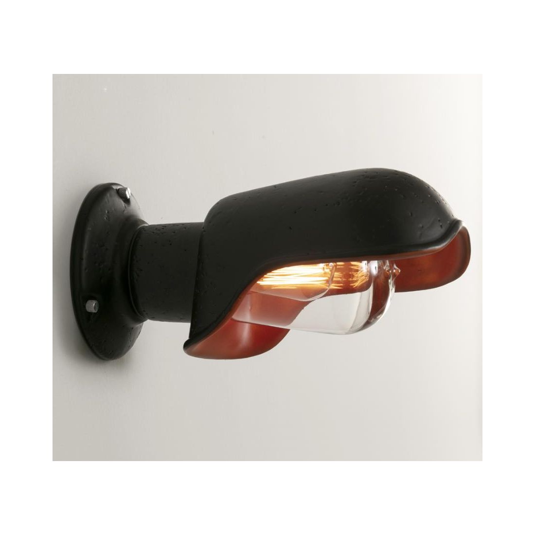 Lampada da parete ideata per ambienti esterni, realizzata a mano in Italia attraverso una produzione 100% artigianale, con la terracotta toscana. Trattasi di un complemento d'arredo caratterizzato da un'estetica vintage che riporta alla mente i design utilizzati una volta rivisitati in chiave contemporanea: la sua forma è sottolineata da linee e tratti sinuosi ed armonici che caratterizzano la lampada donandole una forte personalità e rendendola perfetta per ottenere un'illuminazione funzionale creando atmosfere calde ed accoglienti.