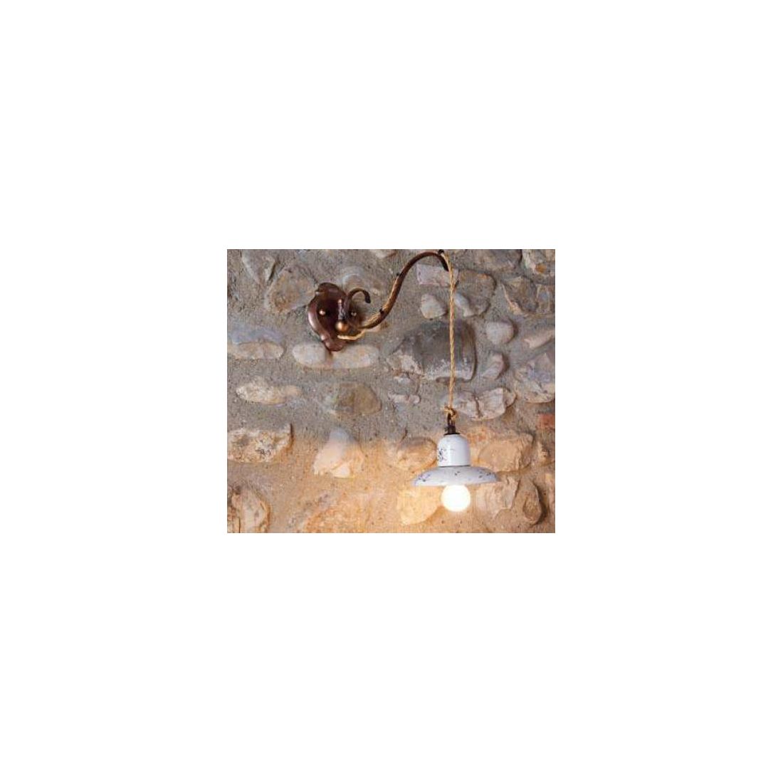 Applique in perfetto stile rustico che si presenta con una struttura realizzata in ottone invecchiato dalla quale parte il cavo elettrico a treccia che sorregge, nella parte finale, la campanina pendente prodotta in ceramica decorata a mano con decoro "Bianco sabbia".