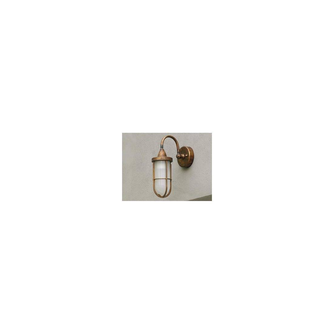 Lampada da esterno a parete in stile rustico, di dimensioni ridotte, realizzata e prodotta in ottone invecchiato con gabbia e vetro di protezione satinato con un diametro di soli cm 10, interamente prodotto in Italia dalla IMAS Firenze.