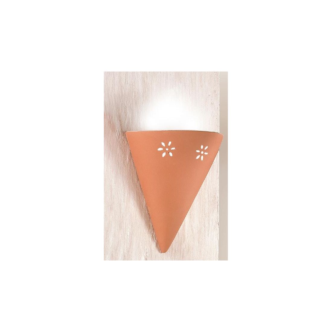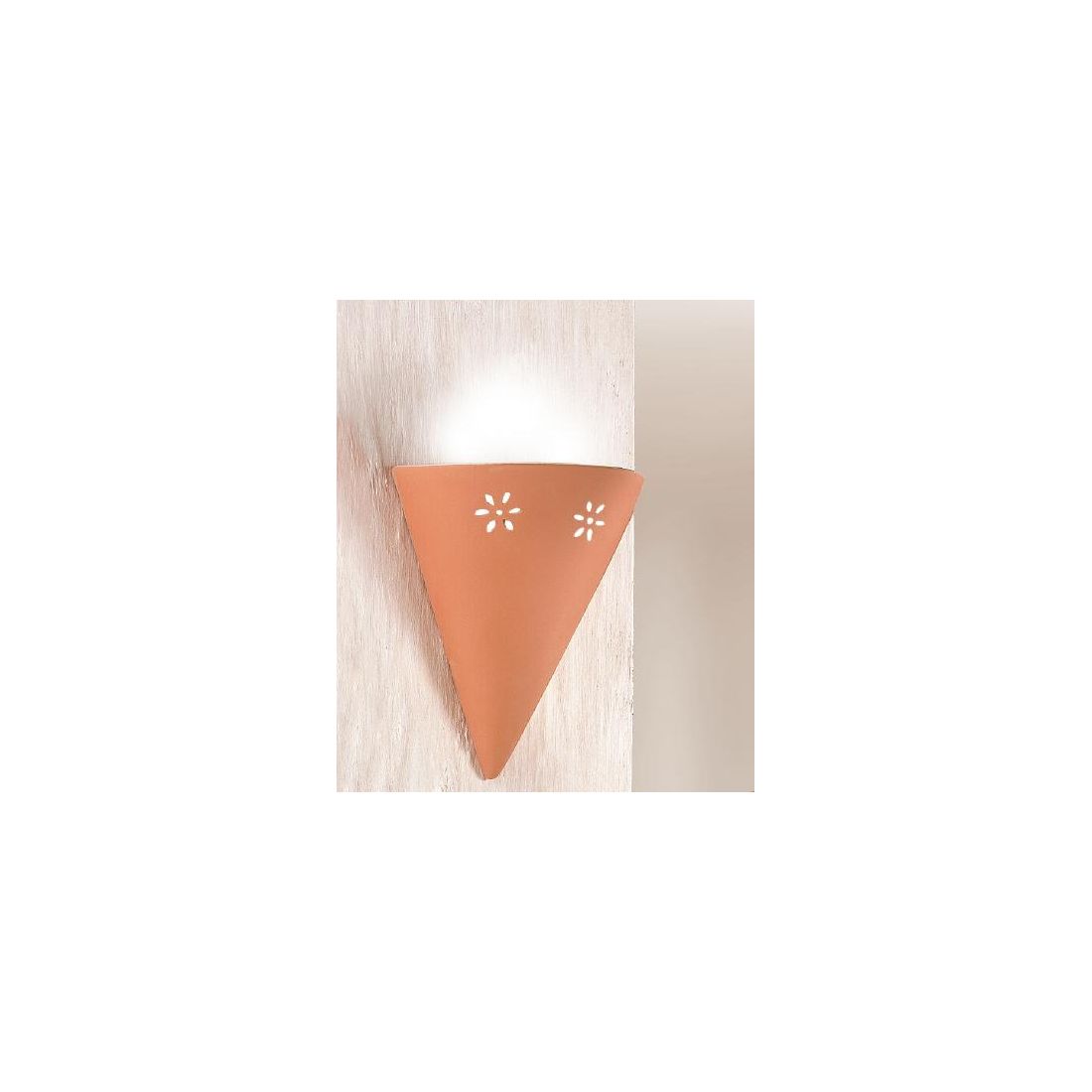Lampada da parete, con una forma a cono, interamente realizzata in terracotta con fiori traforati sulla parte superiore della struttura.