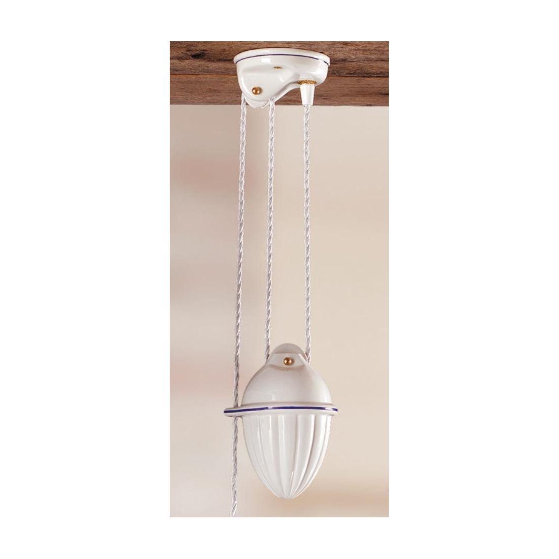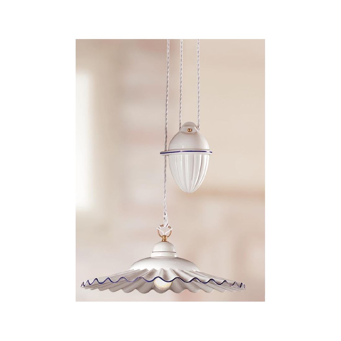 Il lampadario è munito di carrucola contrappeso saliscendi per poter regolare l'altezza del piatto a vostro piacimento e di cavo a treccia di seta bianco.