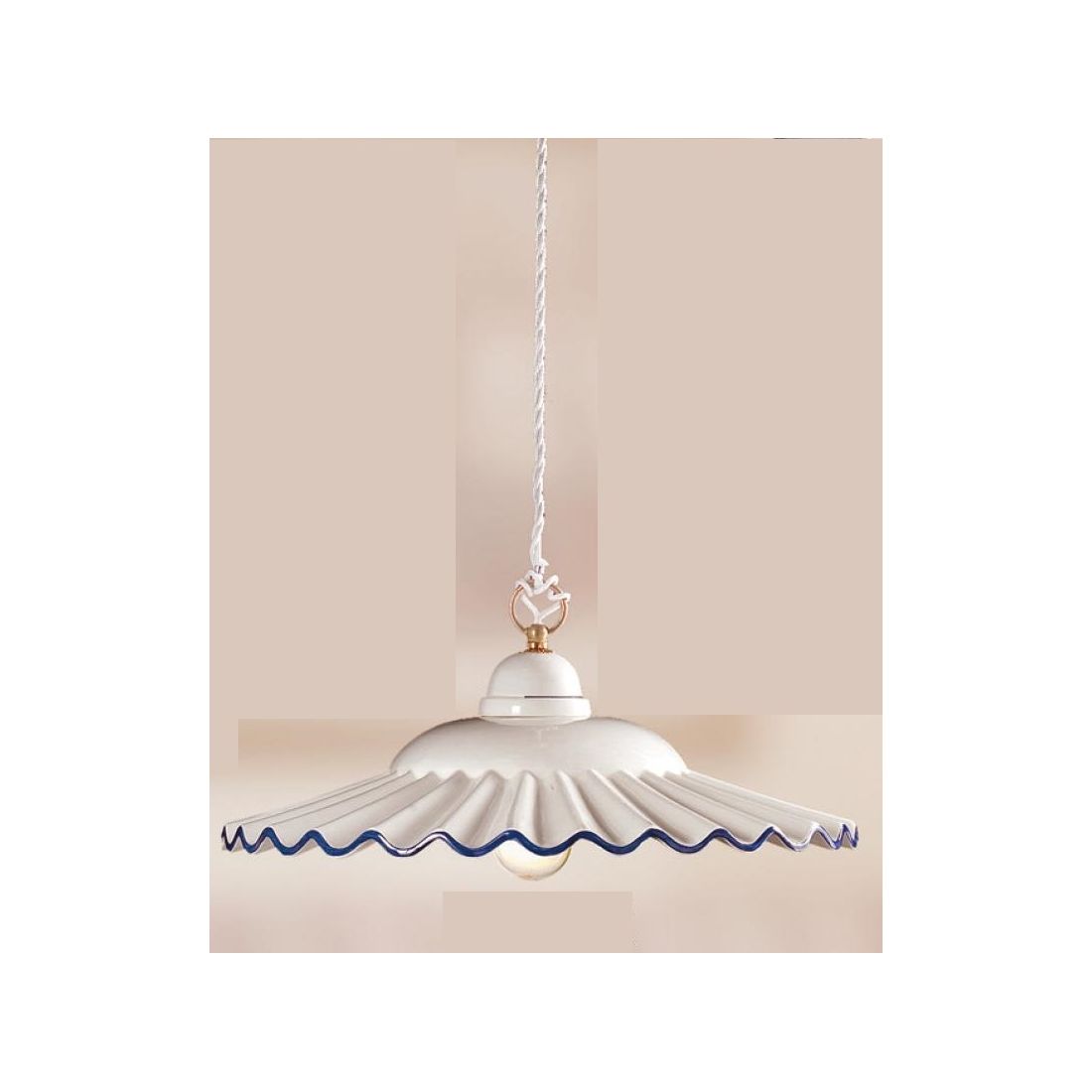 Sospensione saliscendi in stile rustico interamente realizzata in terracotta bianca lucida che si presenta con rosone a soffitto, pigna e piatto plissettato, del diametro di cm 43, il tutto con bordo decorato nel colore Blu (come in foto) oppure nei colori Verde, Marrone, Giallo, Rosso o Ambra.