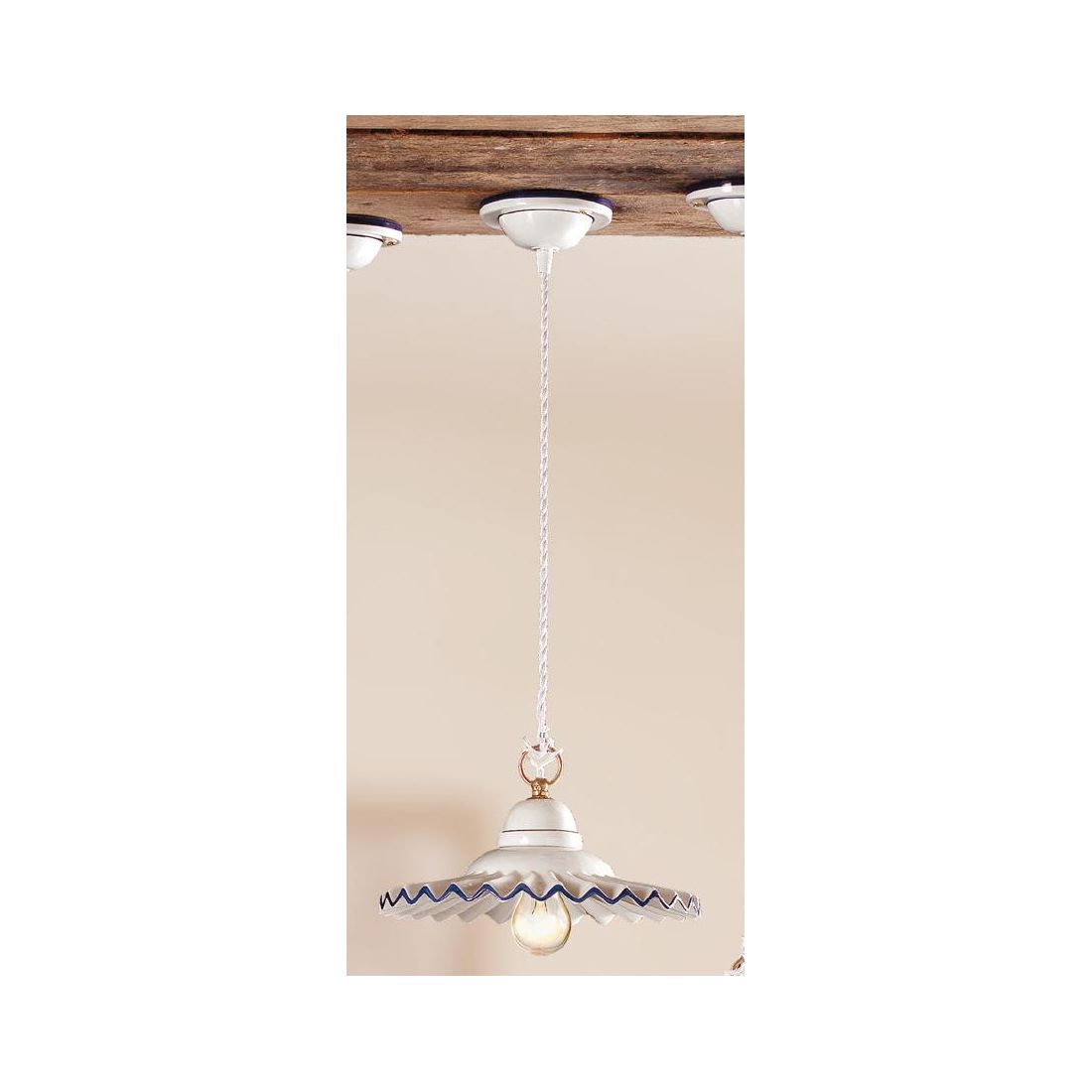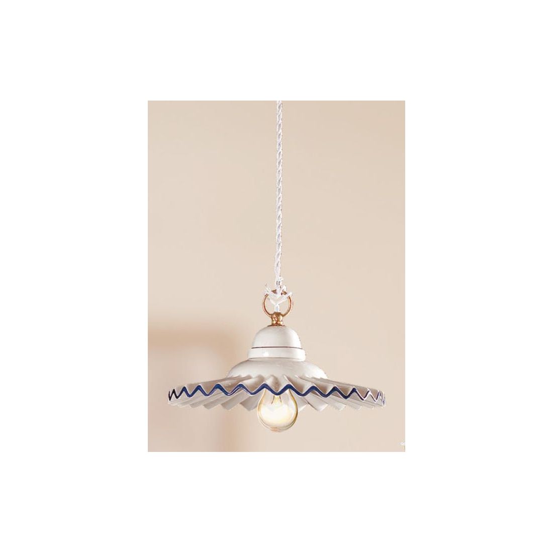 Sospensione singola in stile rustico interamente realizzata in terracotta bianca lucida che si presenta con rosone a soffitto e con un piatto plissettato, del diametro di cm 28, entrambi con bordo decorato nel colore Blu (come in foto) oppure nei colori Verde, Marrone, Giallo, Rosso o Ambra.