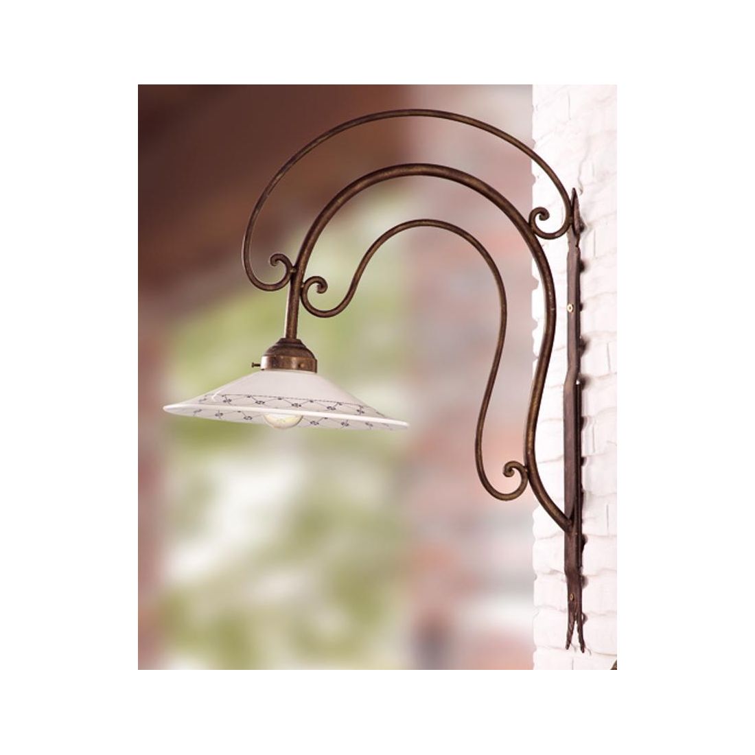 Lampada da parete, dallo stile rustico, che si presenta con struttura elegante con bracci curvi realizzati in ferro battuto verniciato e con il piatto liscio, del diametro di cm 28, prodotto in terracotta bianca lucida con simpatico decoro floreale che può essere realizzato in ben 5 colorazioni, a vostra scelta, tra Blu, Rosso, Marrone, Ambra oppure Verde.