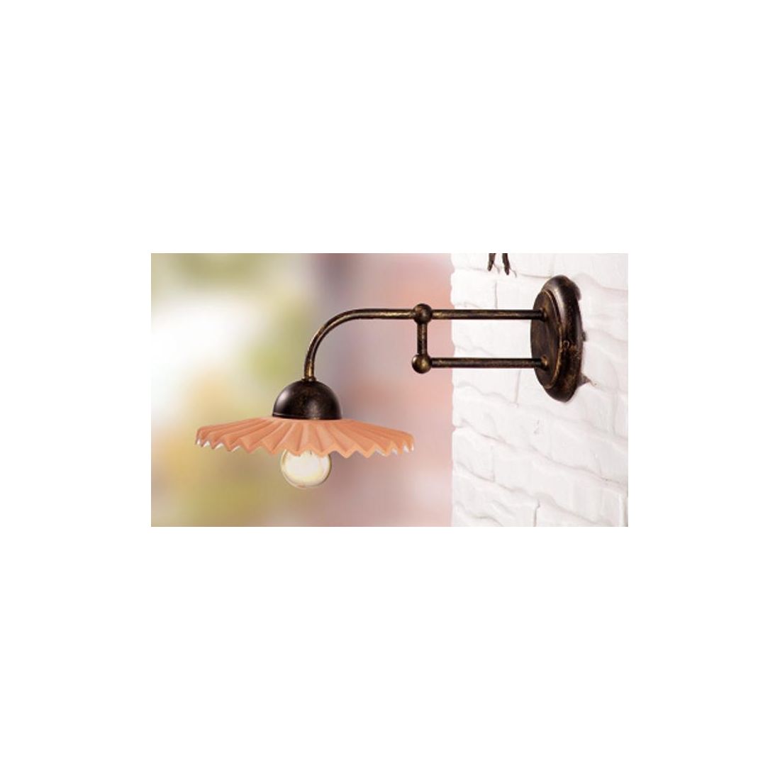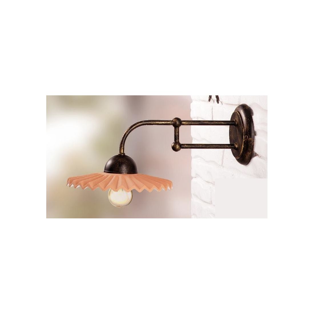 Lampada da parete, dallo stile rustico, che si presenta con struttura a braccio realizzata in ferro battuto verniciato e con il piatto effetto plissè, del diametro di cm 21, prodotto in terracotta nel suo colore naturale decorato di bianco nella sua parte inferiore.