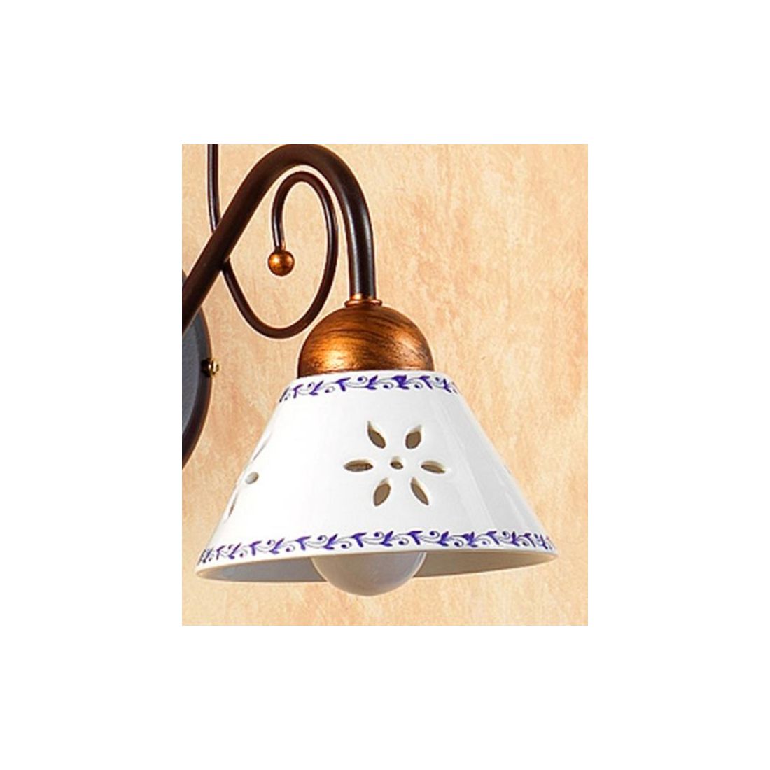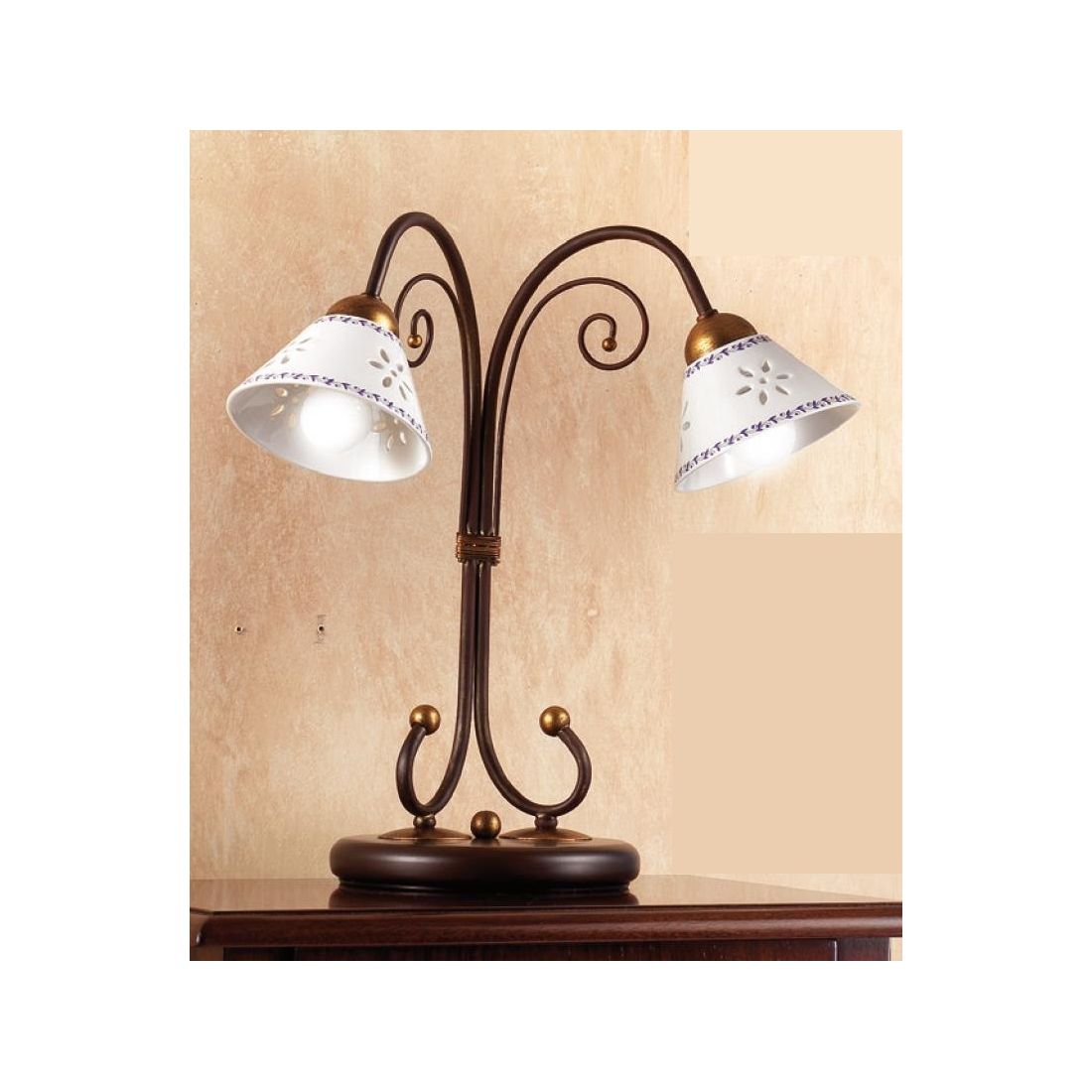 Lampada da tavolo a 2 luci, dallo stile rustico, che si presenta con una struttura realizzata in ferro verniciato nel colore Ruggine e con i diffusori, di forma conica, del diametro di cm 14 cadauno, prodotti in ceramica bianca lucida traforata arricchiti da eleganti decorazioni floreali sui bordi disponibili in ben 5 colorazioni, a vostra scelta, tra Blu, Verde, Marrone, Rosso e Ambra.