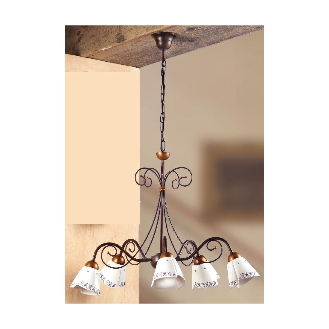 Lampadario a sospensione a cinque luci dallo stile rustico che si presenta con una struttura e catena realizzate in ferro verniciato nel colore Ruggine impreziosite da dettagli in ottone e con 5 diffusori a fazzoletto, del diametro di cm 14, prodotti in ceramica bianca lucida con decori floreali sul bordo che si realizzare in tre diverse colorazioni, a vostra scelta, tra Blu, Verde e Marrone.
