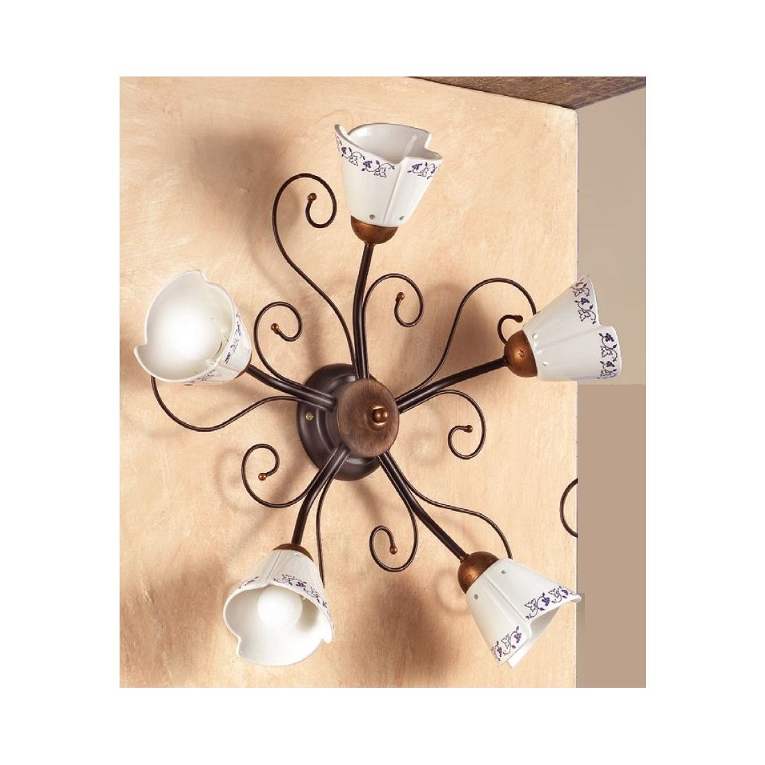 Plafoniera a cinque luci dallo stile rustico che si presenta con una struttura realizzata in ferro verniciato nel colore Ruggine impreziosita da dettagli in ottone e con 5 diffusori a fazzoletto, del diametro di cm 14, prodotti in ceramica bianca lucida con decori floreali sul bordo che si realizzare in tre diverse colorazioni, a vostra scelta, tra Blu, Verde e Marrone.