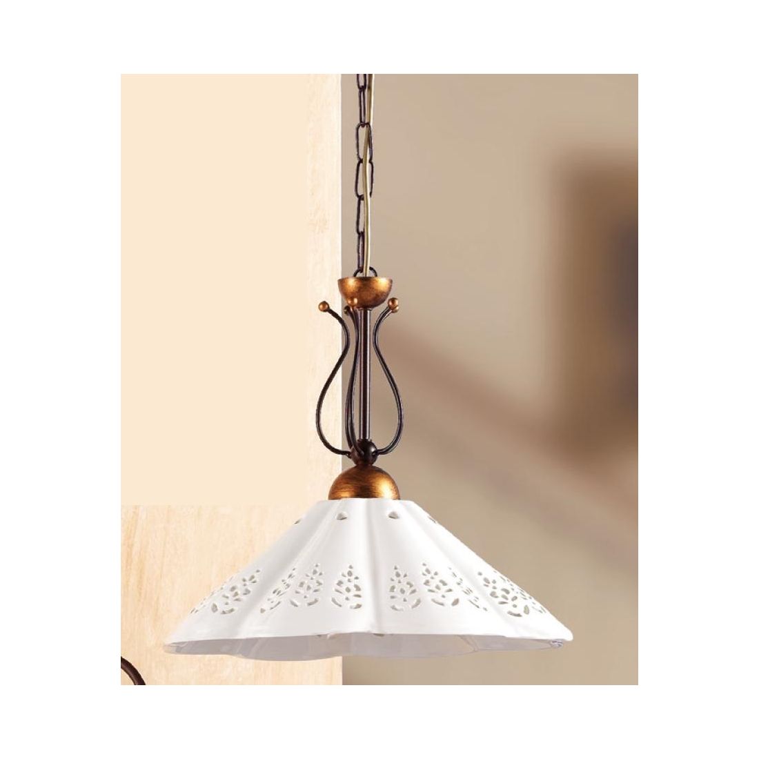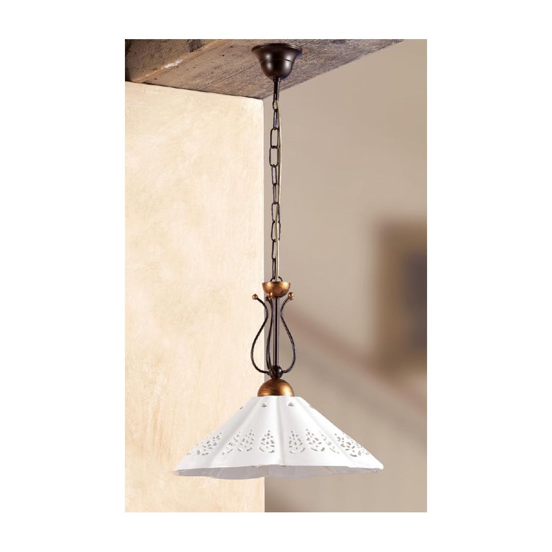 Sospensione singola dallo stile rustico che si presenta con una struttura e catena realizzati in ferro verniciato nel colore Ruggine e con il diffusore, del diametro di cm 39, prodotto in ceramica bianca lucida traforata con bordo smerlato.