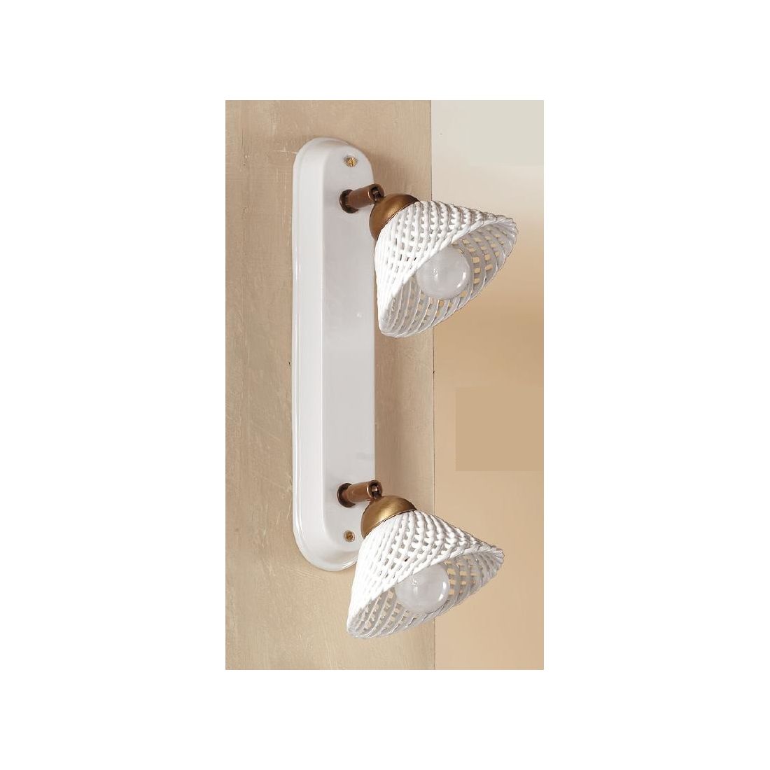 2042.2 APPLIQUE PLAFONIERA 2 LUCI IN TERRACOTTA BIANCA TRAFORATA E OTTONE STILE RUSTICO MADE IN ITALY CRISTALENSI CERAMICA - Cri