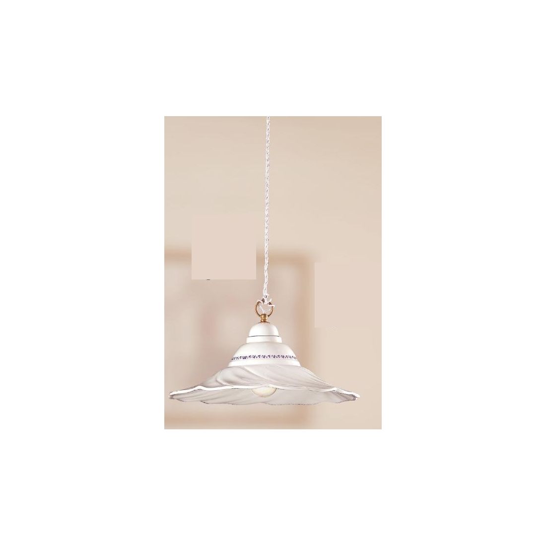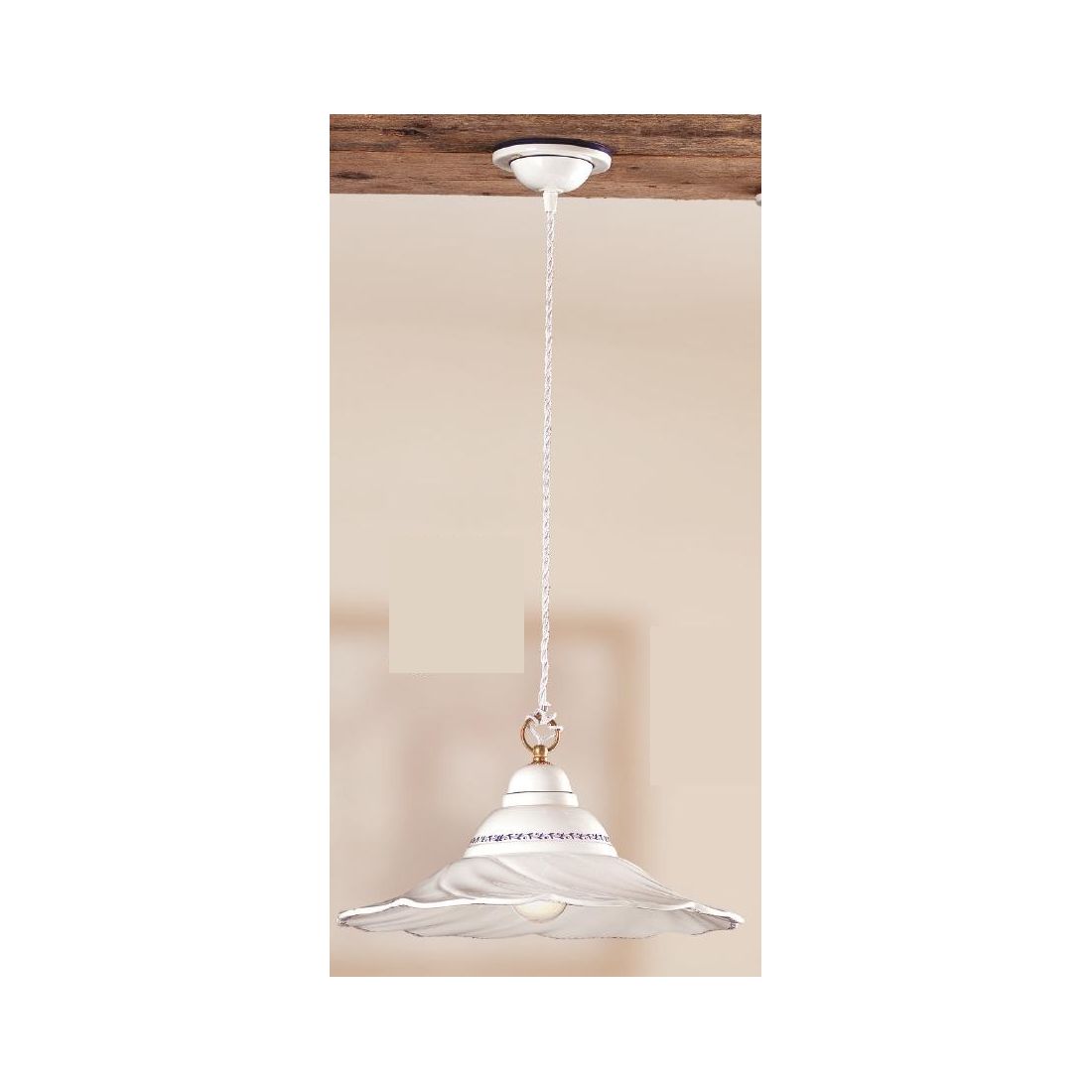 Sospensione singola in stile rustico interamente realizzata in terracotta bianca che si presenta con rosone a soffitto e con il piatto ondulato impreziosito da piccoli decori di colore Blu (come in foto) oppure disponibili nei colori Verde, Marrone, Rosso o Ambra.