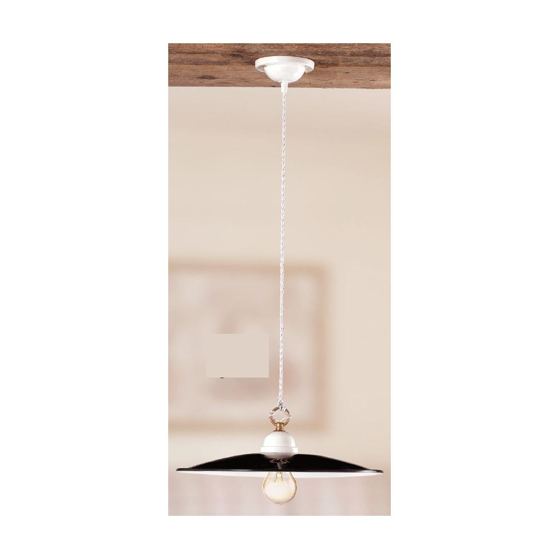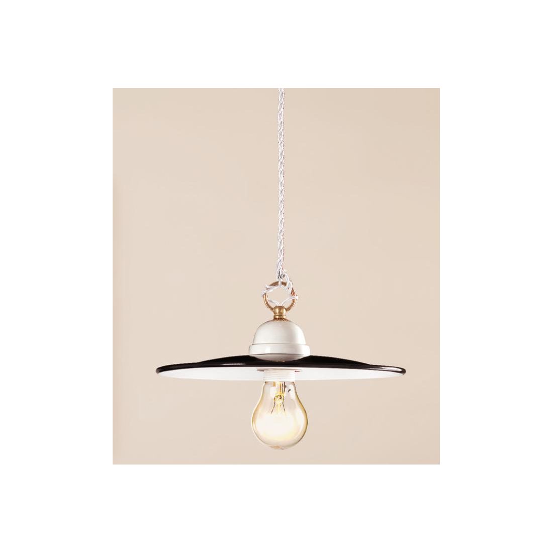 Sospensione singola in stile rustico interamente realizzata in terracotta che si presenta con rosone a soffitto bianco e con il piatto, di forma piatta e liscia, verniciato nel colore Nero sulla parte superiore e di colore Bianco nella parte inferiore. Il piatto viene prodotto in due diverse misure, a vostra scelta, con diametro di cm 30 oppure con diametro di cm 40.