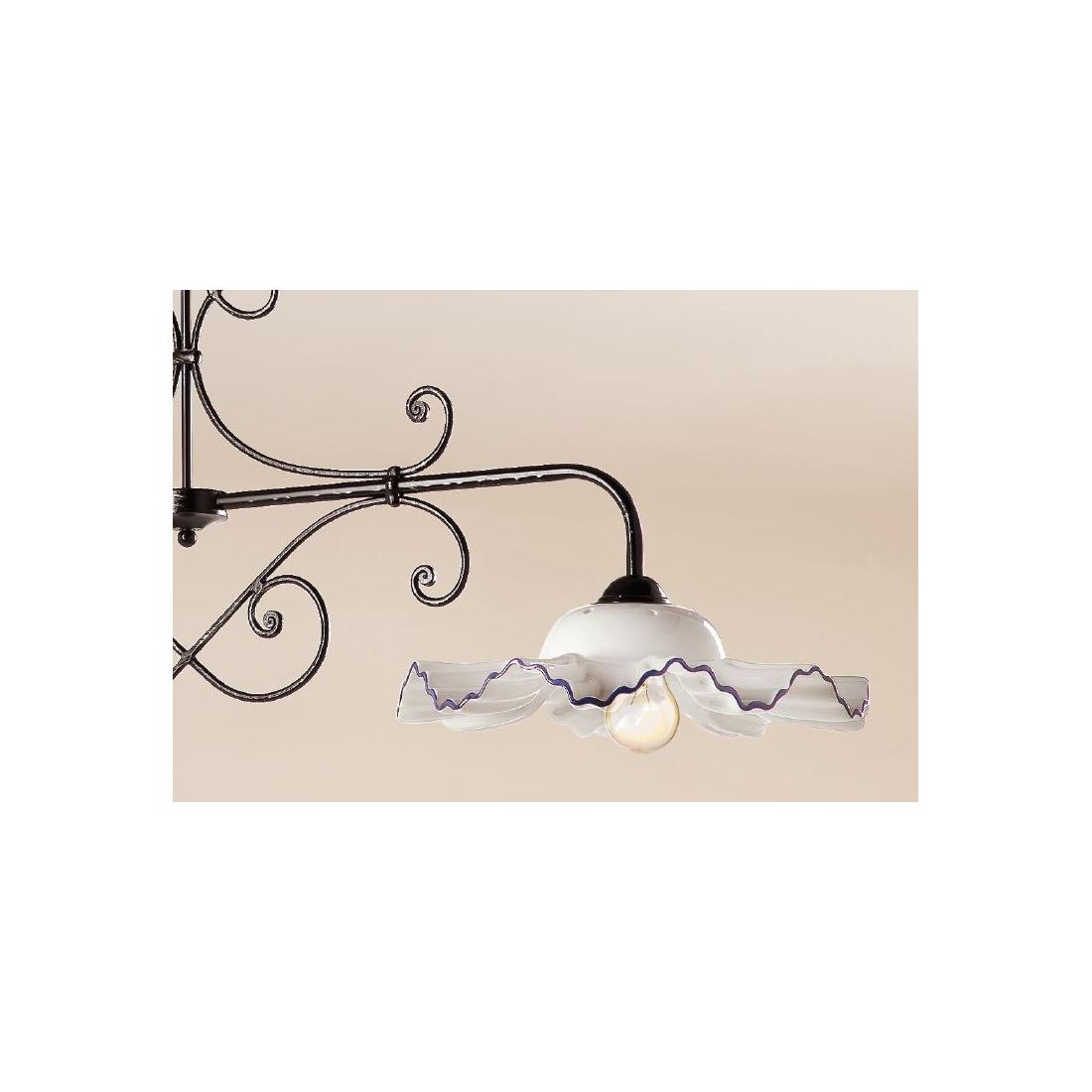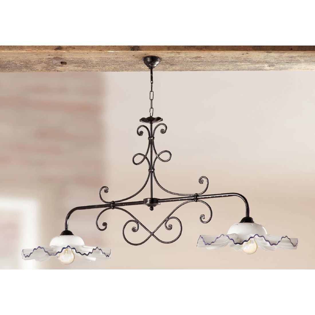 Bilanciere a 2 luci dallo stile rustico che si presenta con una struttura molto elegante e particolare che viene realizzata in metallo verniciato nel colore Nero con effetto anticato e con i diffusori smerlati, del diametro di cm 40 cadauno, prodotti in terracotta bianca lucida con bordino e fili decorati disponibili in ben 6 diverse colorazioni, a vostra scelta, tra Blu, Giallo, Ambra, Rosso, Verde e Marrone.