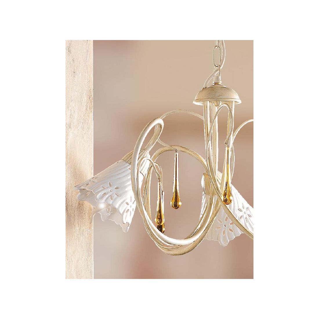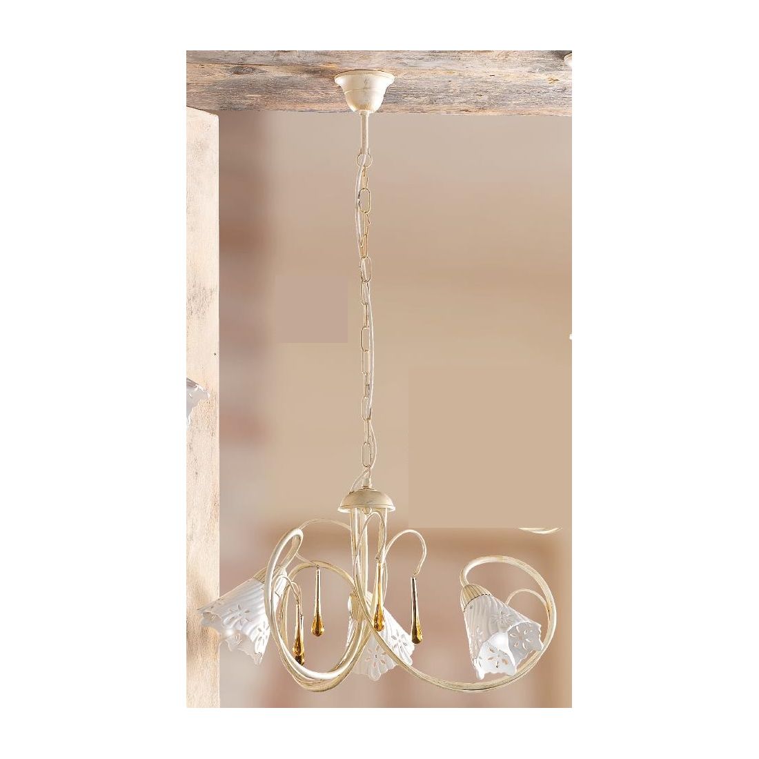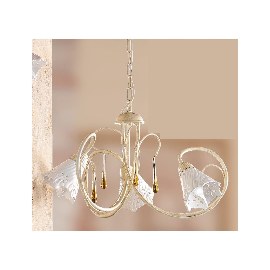 Lampadario a 3 luci dallo stile classico che si presenta con una struttura realizzata in metallo con finitura Avorio impreziosita da gocce pendenti in vetro di Murano e con paralumi, effetto rigato, prodotti in ceramica bianca traforata. La sospensione è sostenuta da una catena regolabile in lunghezza, ha un diametro totale di 55 cm e i singoli diffusori hanno un diametro di 12 cm.