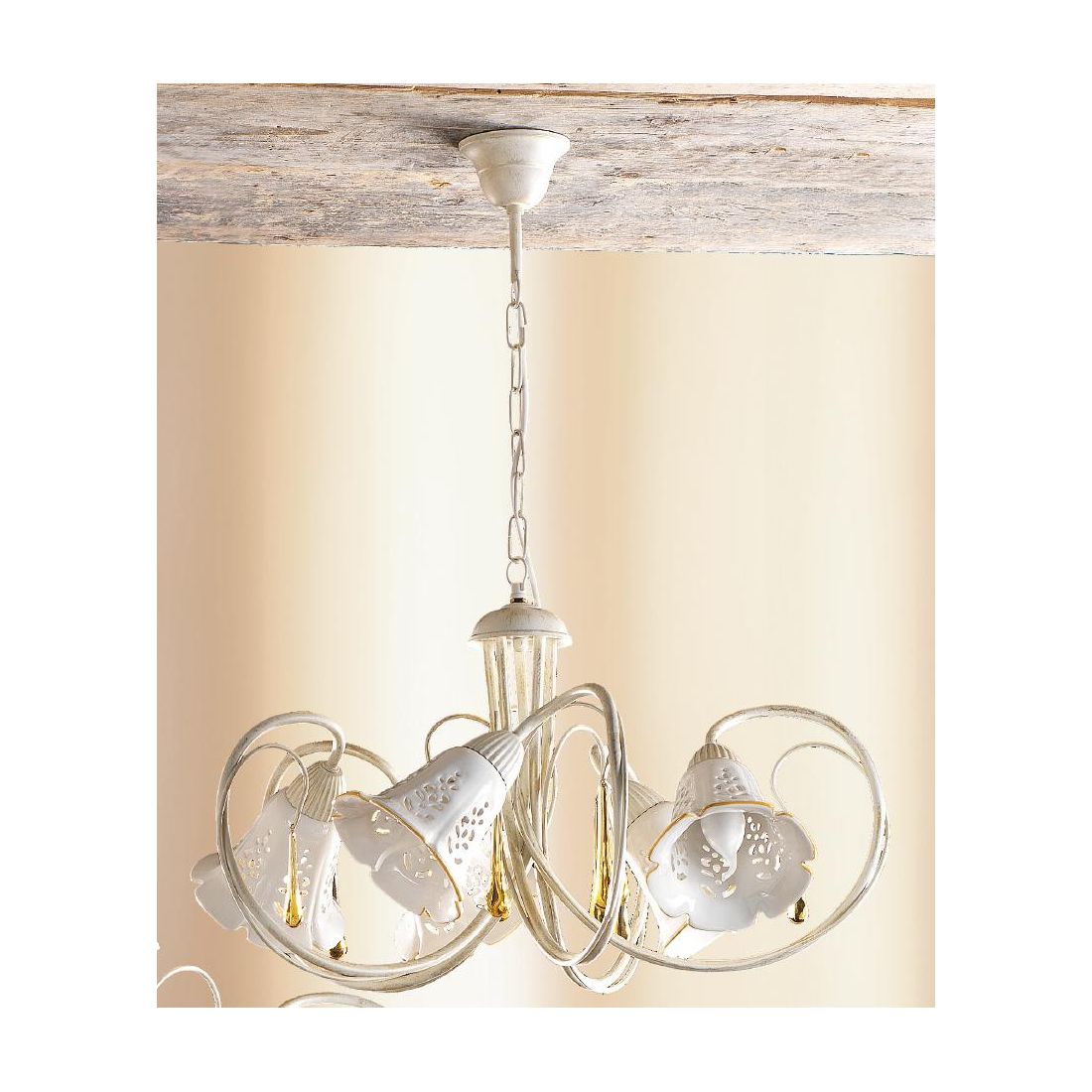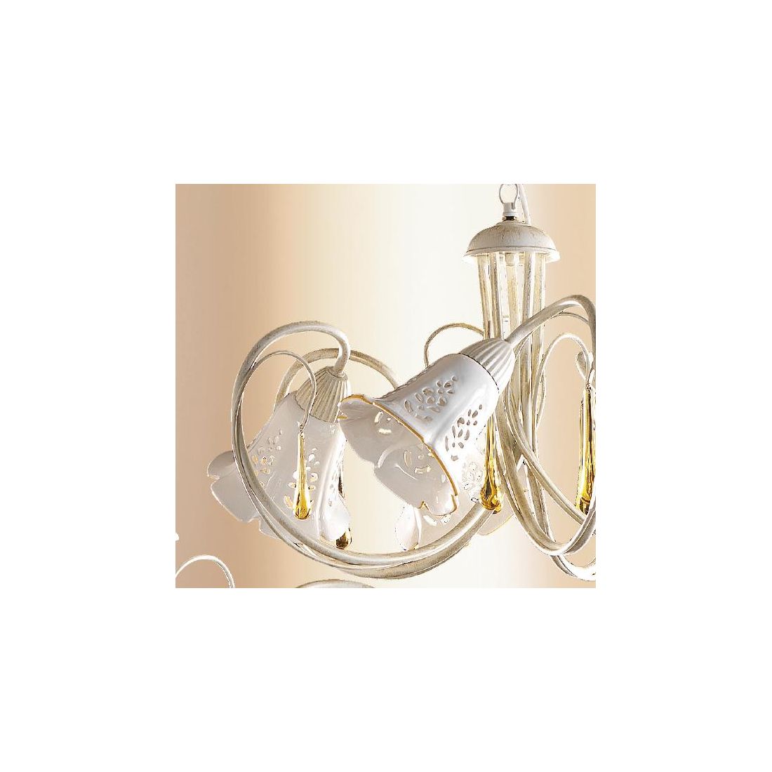 Lampadario a 5 luci dallo stile classico che si presenta con una struttura realizzata in metallo con finitura Avorio impreziosita da gocce pendenti in vetro di Murano e con i paralumi a campanella prodotti in ceramica bianca traforata con bordino colorato. La sospensione è sostenuta da catena in ferro regolabile in lunghezza, ha un diametro totale di 55 cm e i singoli paralumi hanno un diametro di 13 cm.