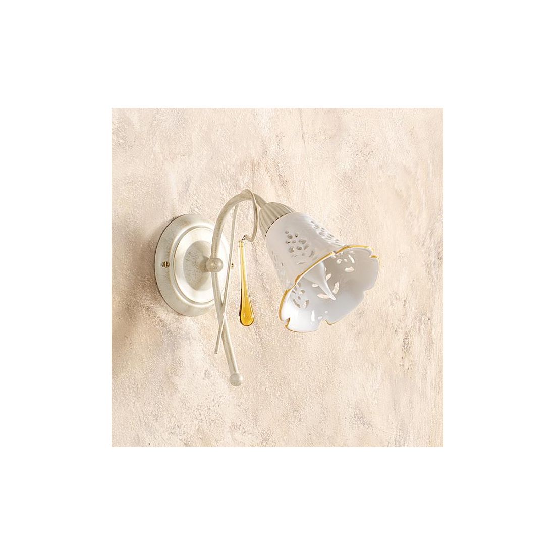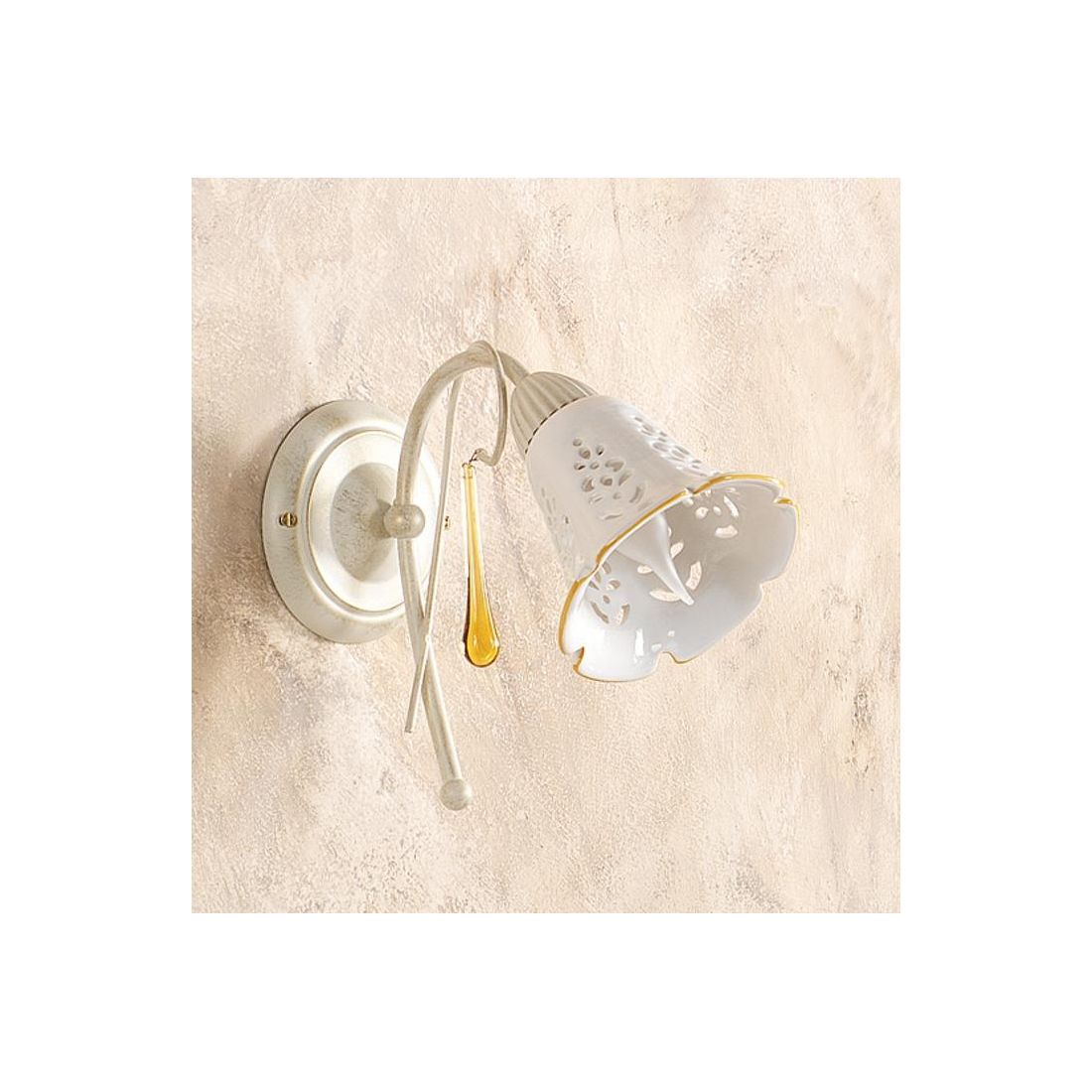 Applique dallo stile classico che si presenta con una struttura realizzata in metallo con finitura Avorio impreziosita da gocce pendenti in vetro di Murano e con il paralume a campanella prodotto in ceramica bianca traforata con bordino colorato. La lampada ha un altezza totale di 24 cm e il diffusore ha un diametro di 13 cm.