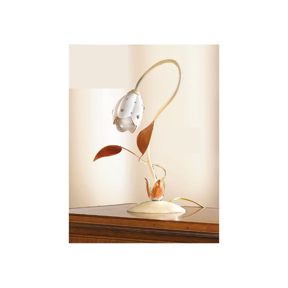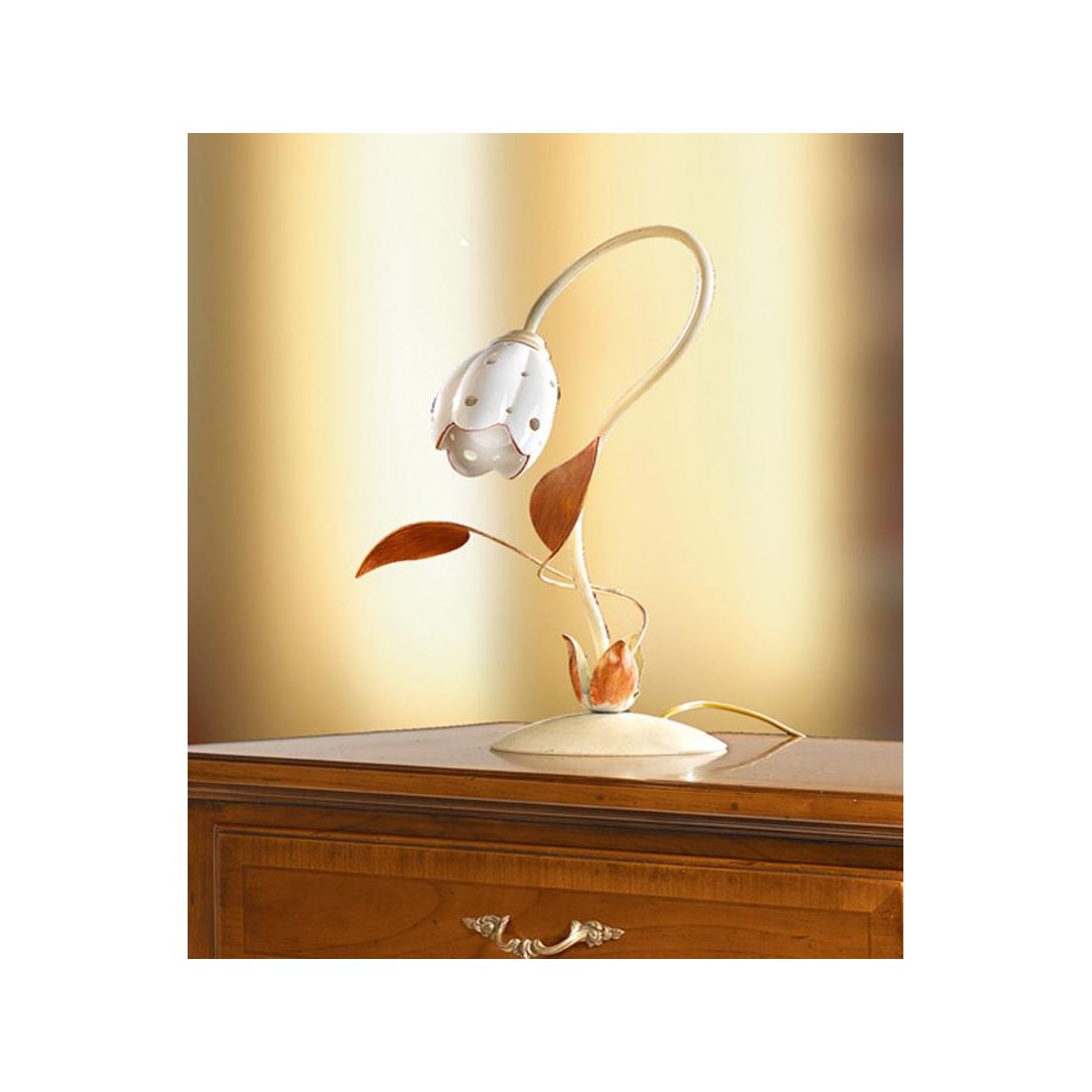 Lampada da tavolo dallo stile classico che si presenta con una struttura realizzata in metallo con finitura Avorio impreziosita da foglie color bronzo con il paralume, che prende la forma di un tulipano, prodotto in ceramica bianca traforata con bordino colorato. Il lumetto ha un altezza totale di 40 cm e il paralume ha un diametro di 11 cm.