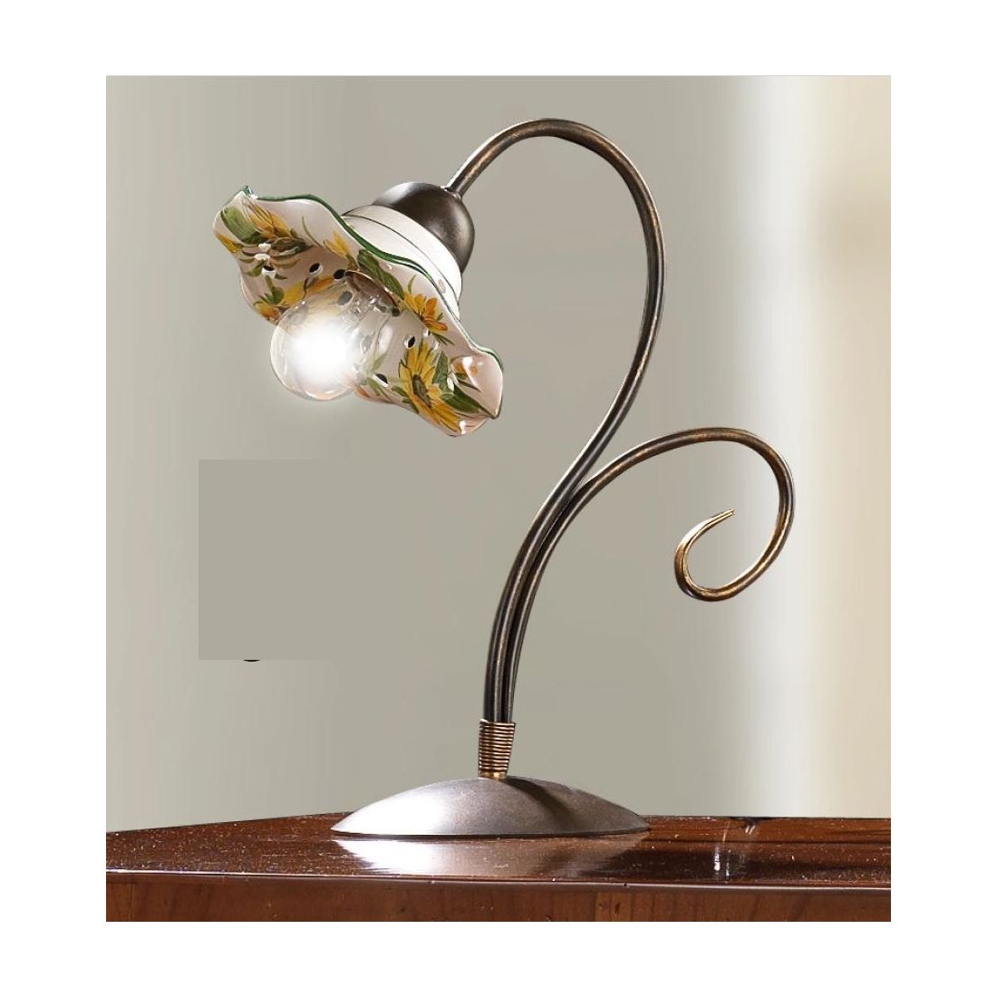 Lampada da tavolo dallo stile rustico che si presenta con una struttura realizzata in metallo con finitura Ruggine e con il diffusore, con bordo smerlato, del diametro di cm 18, prodotto in terracotta bianca lucida traforata arricchito da eleganti decorazioni floreali con girasoli gialli e bordini rifiniti nel colore verde.