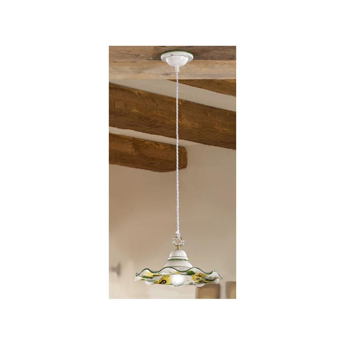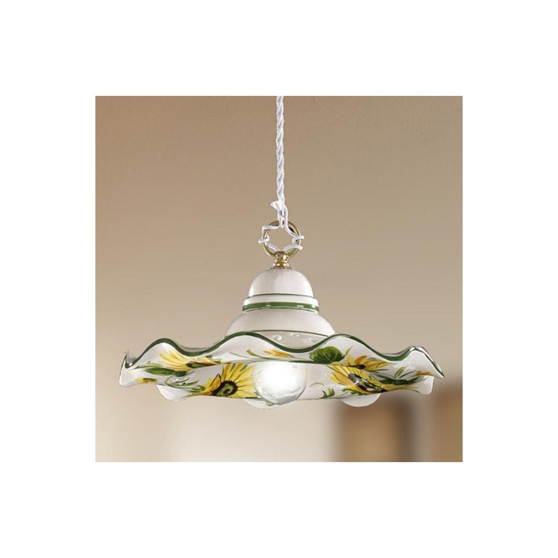 Sospensione singola in stile rustico che si presenta con rosone a soffitto e piatto smerlato, del diametro di cm 32, prodotto in terracotta bianca lucida traforata arricchito da eleganti decorazioni floreali con girasoli e bordini colorati nel colore verde.