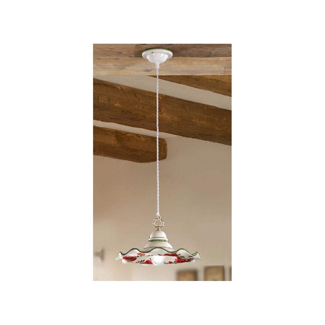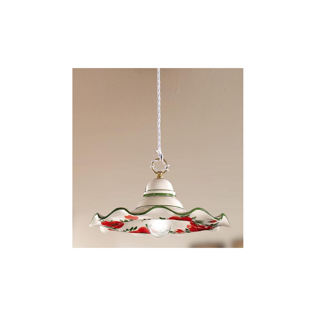 Sospensione singola in stile rustico che si presenta con rosone a soffitto e piatto smerlato, del diametro di cm 32, prodotto in terracotta bianca lucida traforata arricchito da eleganti decorazioni floreali con tulipani rossi e bordini rifiniti nel colore verde.