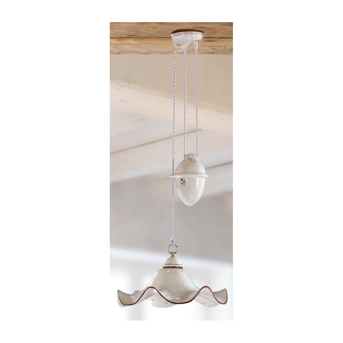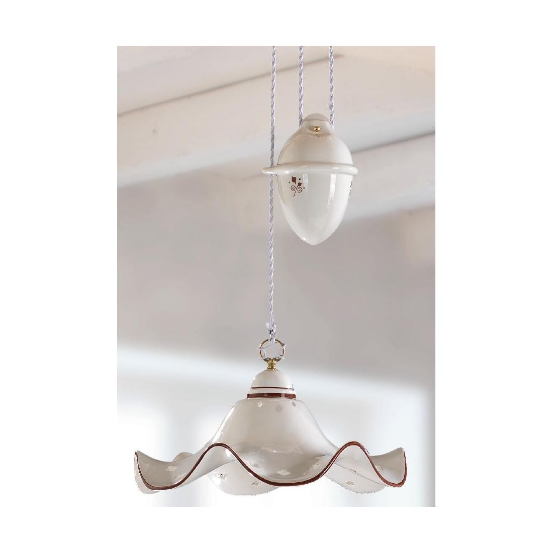 Sospensione saliscendi in stile rustico che si presenta con rosone a soffitto, pigna e piatto smerlato, del diametro di cm 40, prodotto in terracotta bianca lucida traforata arricchito da piccoli ed eleganti decorazioni floreali sulla parte inferiore e con bordo rifinito in tinta con il colore del decoro.