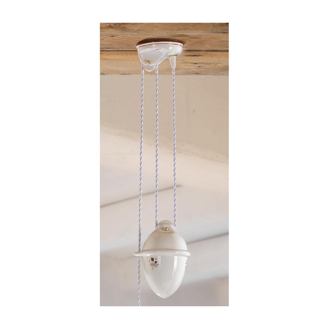 Il lampadario è munito di carrucola con contrappeso saliscendi, anch'esso con decoro floreale, utile per poter regolare l'altezza del piatto a vostro piacimento e di cavo a treccia di seta bianco.