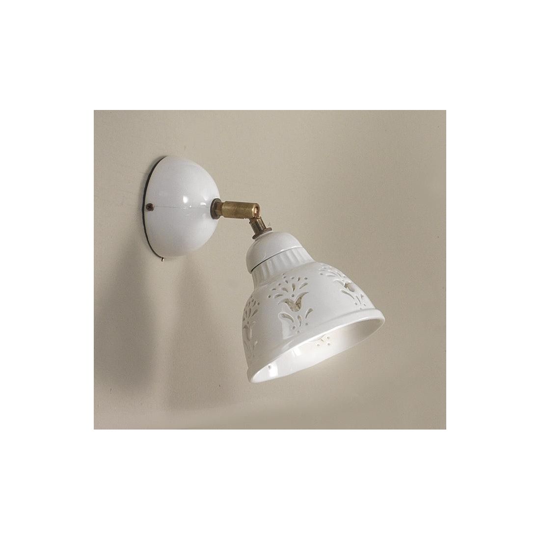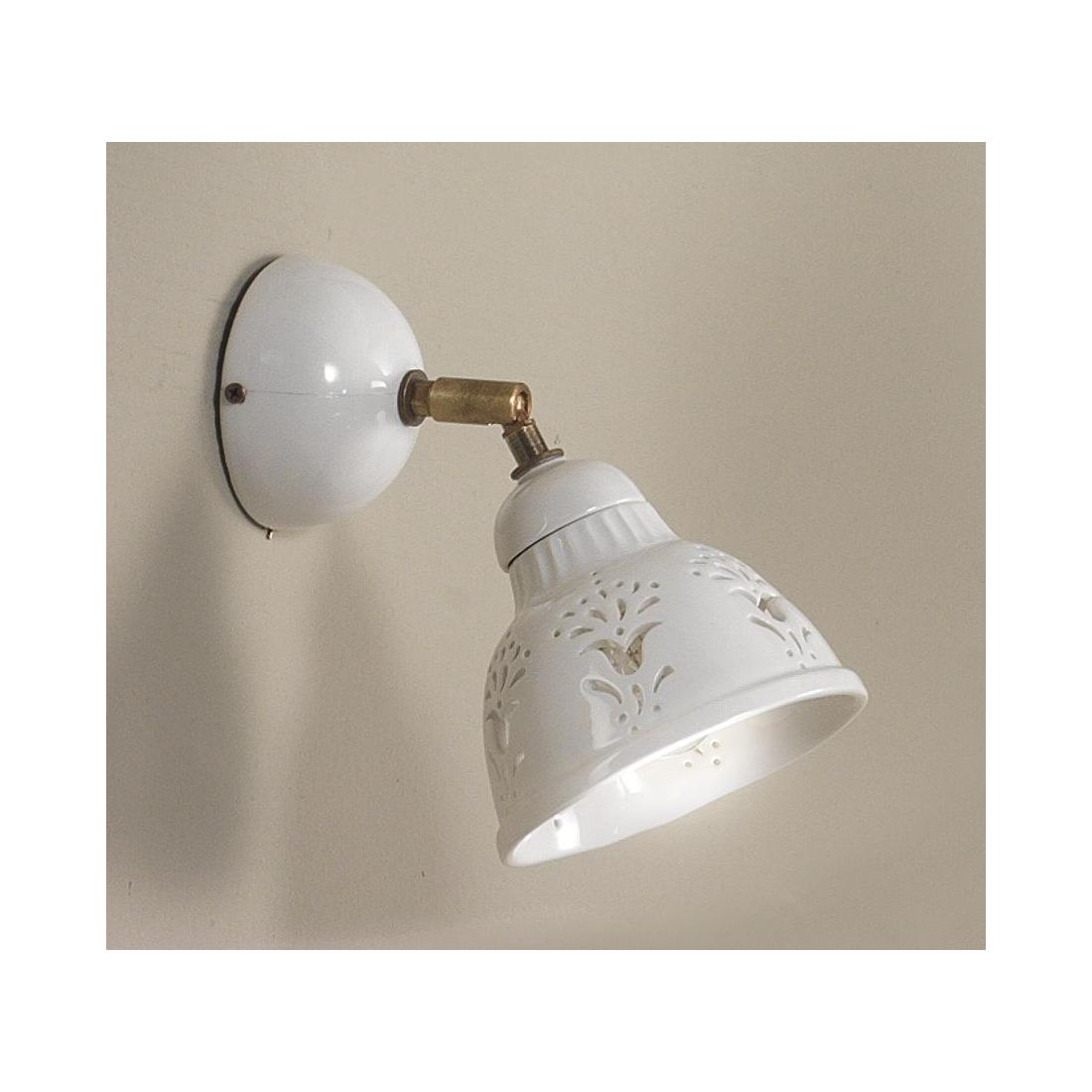 Applique/Spot in perfetto stile rustico e country che si presenta con un diffusore a campana del diametro di cm 13.5 realizzato in ceramica bianca con motivi floreali intagliati e con base a muro liscia munita anche di snodo, in ottone invecchiato, che vi permetterà di orientare il punto luce dove più vi necessita.