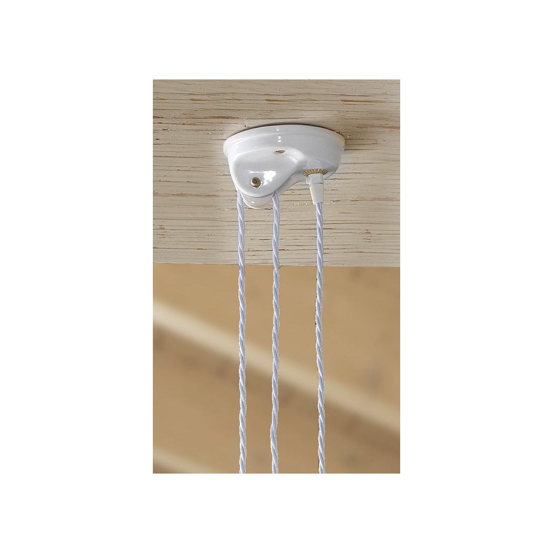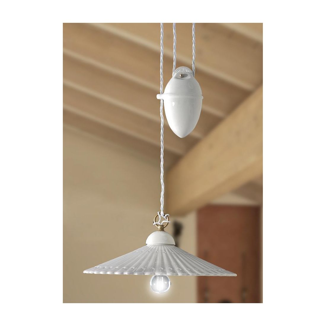 Sospensione saliscendi in perfetto stile rustico e country che si presenta con rosone a soffitto e con piatto plissettato del diametro di cm 37 realizzato in ceramica bianca traforata impreziosito da dettagli in ottone invecchiato; è munita di carrucola contrappeso saliscendi per poter regolare l'altezza del diffusore e di cavo a treccia di seta bianco.
