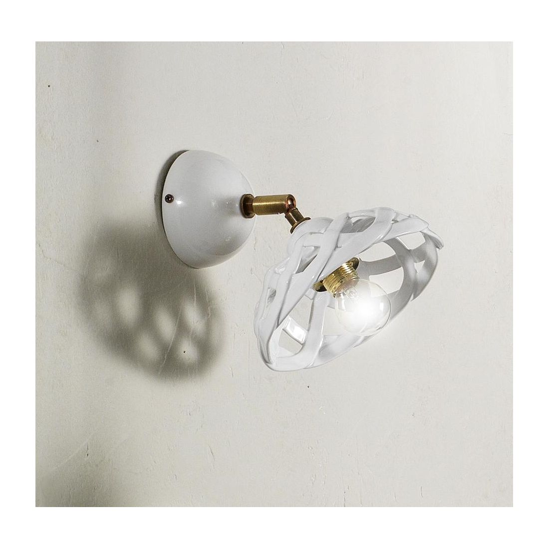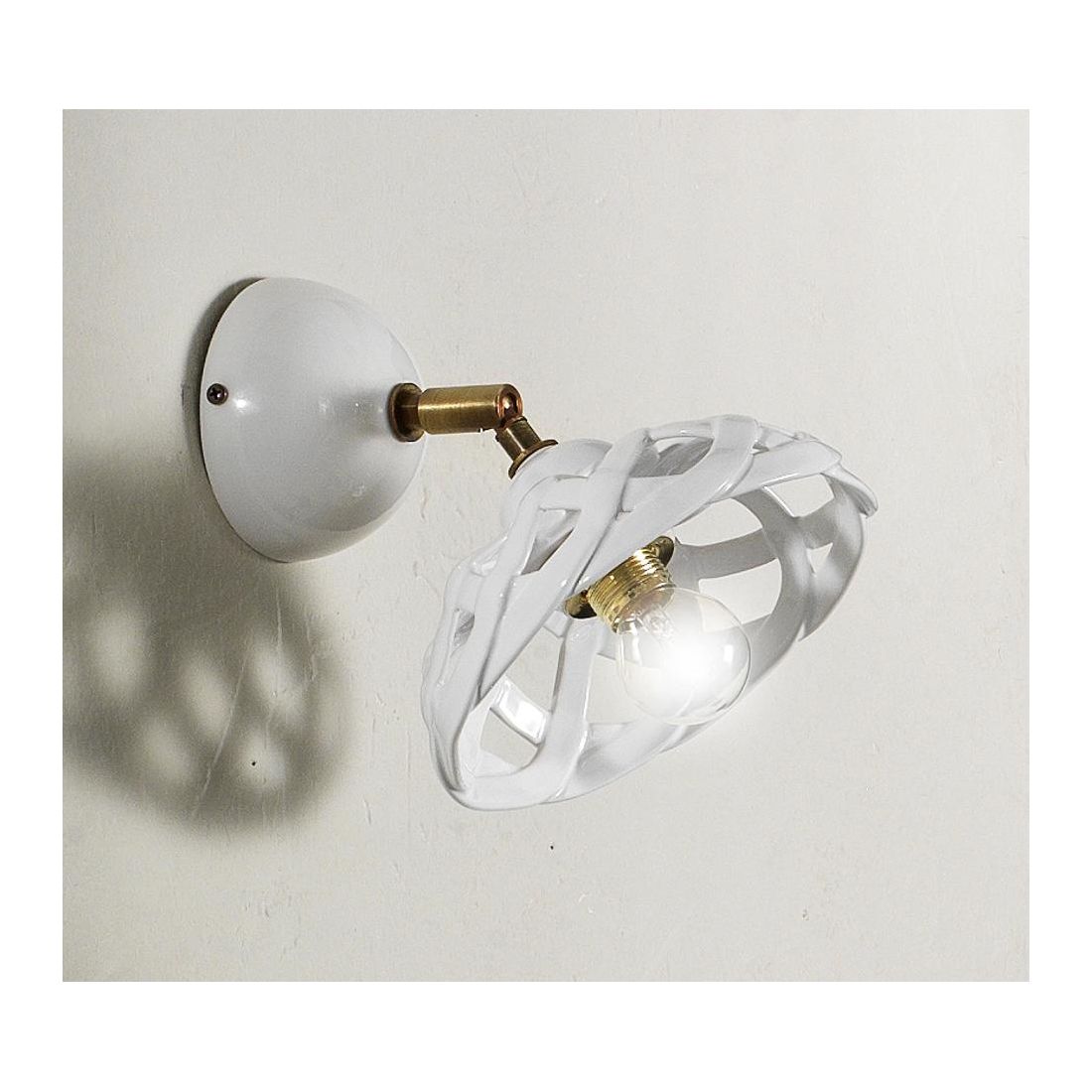 Applique Spot in stile rustico e country che si presenta con un diffusore, che richiama la particolare forma di cesta intrecciata, del diametro di cm 17, realizzato in ceramica bianca lucida; è munita di snodo, posto sulla base a muro prodotto in ottone invecchiato, che vi permetterà di orientare il punto luce dove più vi necessita.
