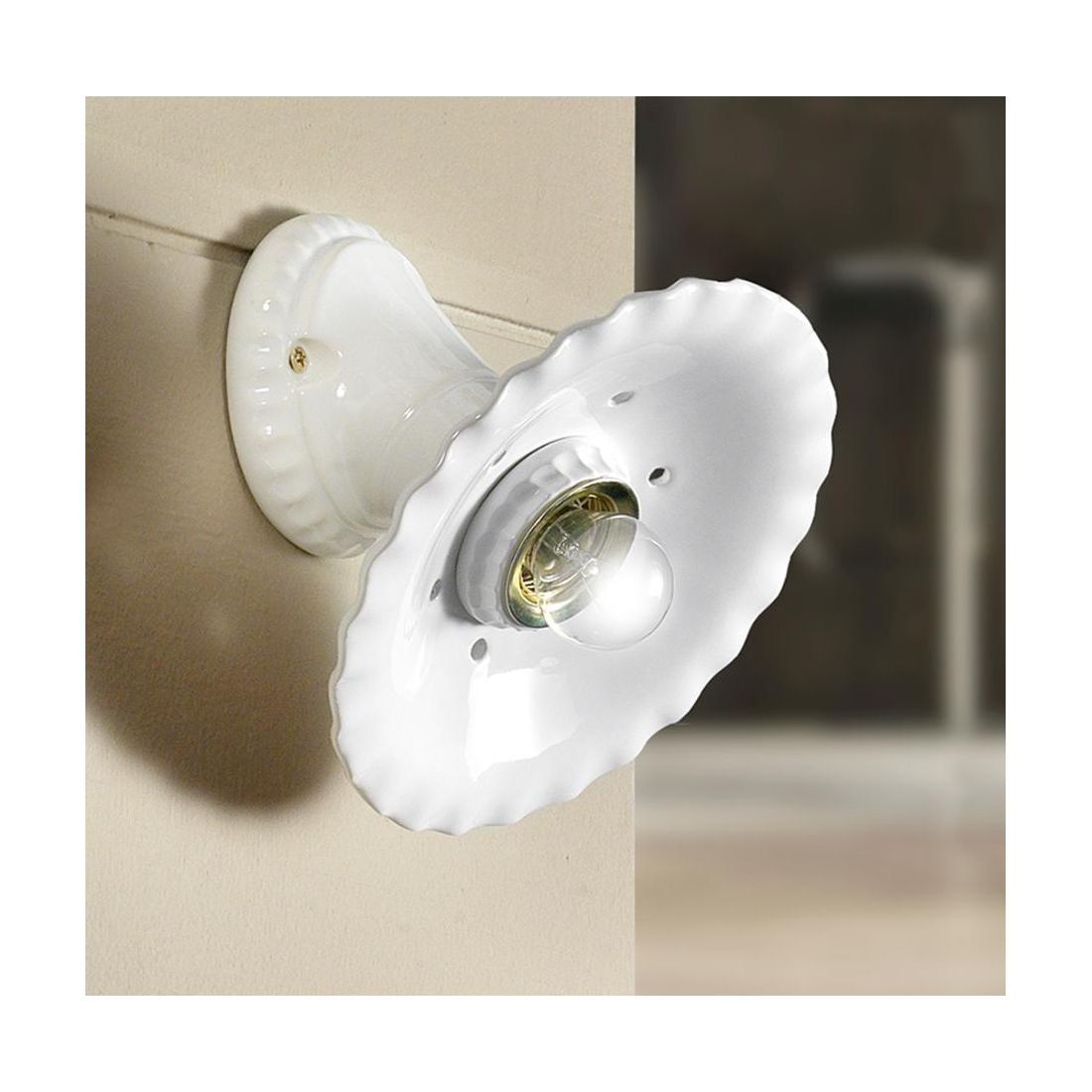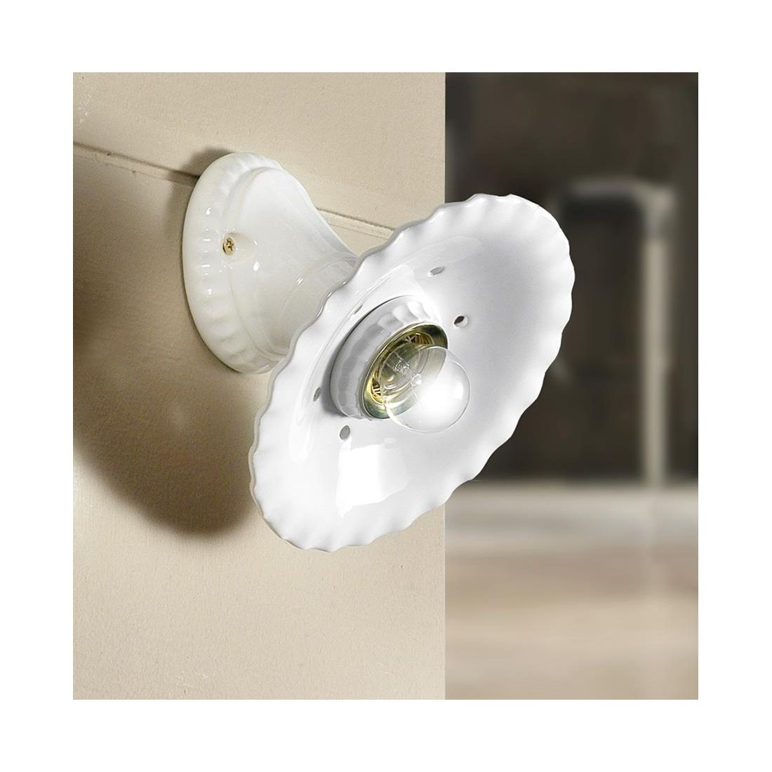 Applique in stile rustico e country realizzata interamente in terracotta bianca con il diffusore plissettato con piccoli forellini traforati vicino al bordo, con un diametro di cm 21.5.