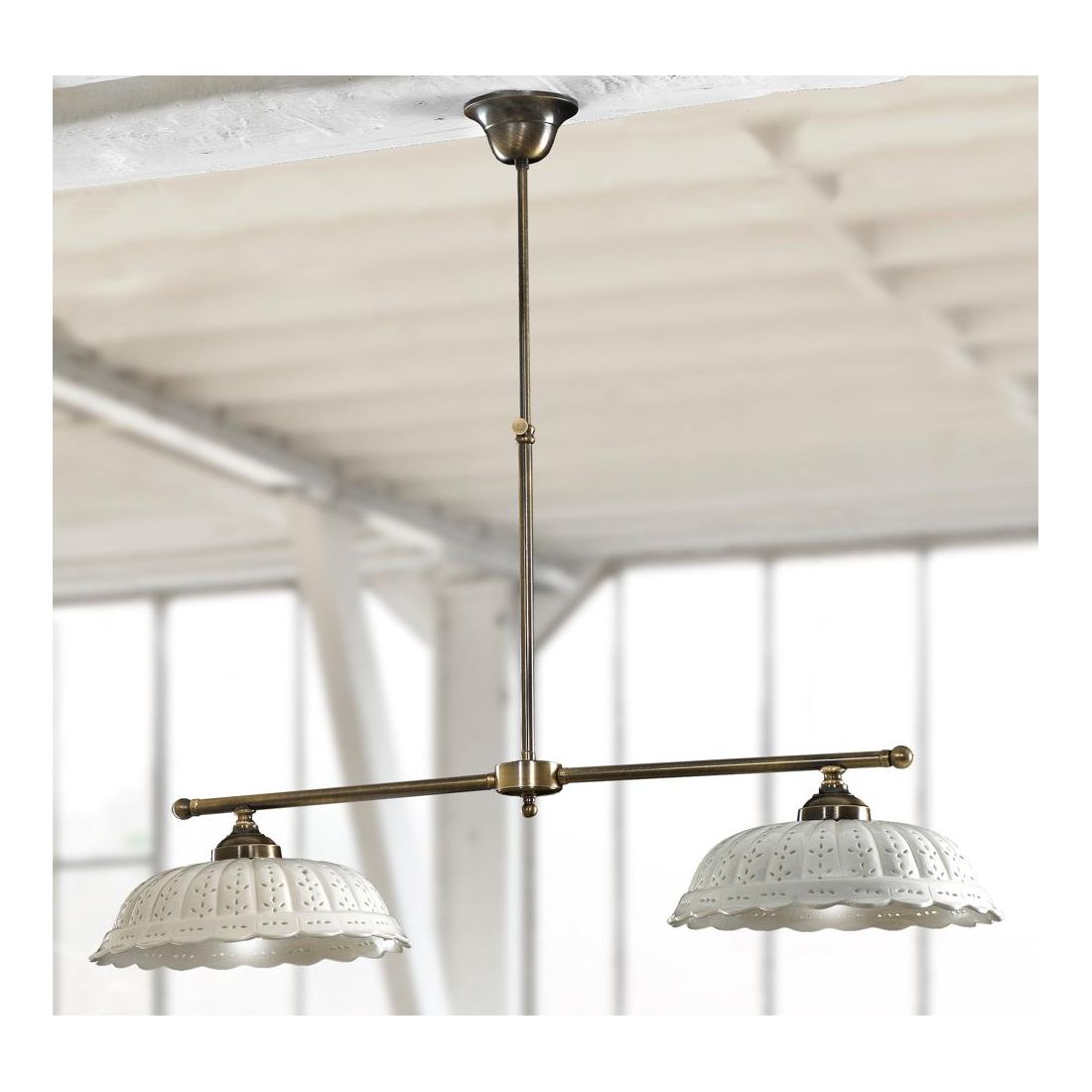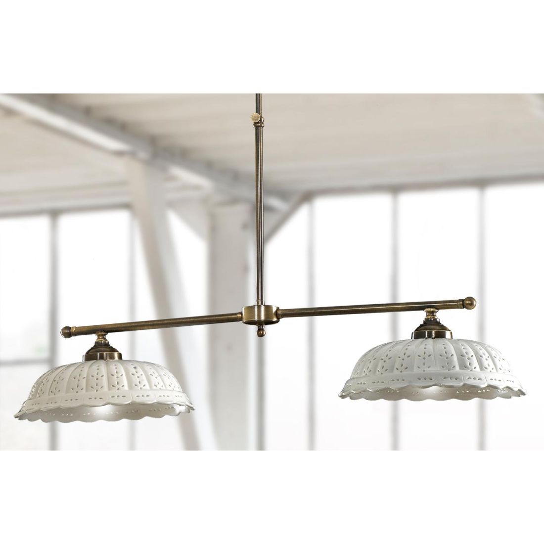 Bilanciere a 2 luci dallo stile rustico e country composto da una struttura lineare, regolabile in altezza, realizzata in ottone invecchiato e da due diffusori realizzati in terracotta bianca con simpatici motivi floreali intagliati del diametro di cm 31 cad.