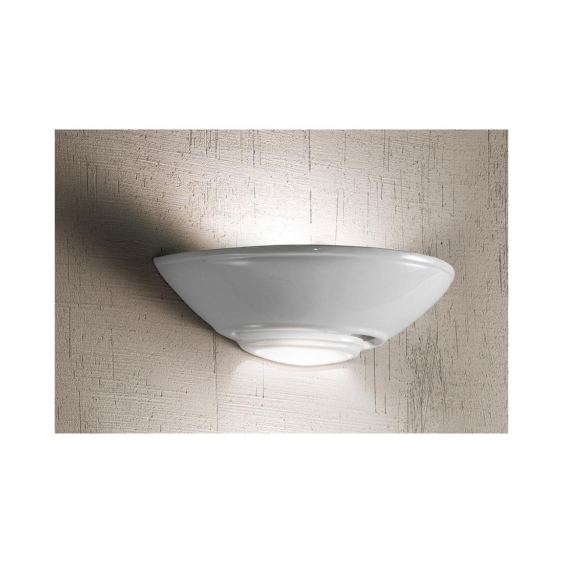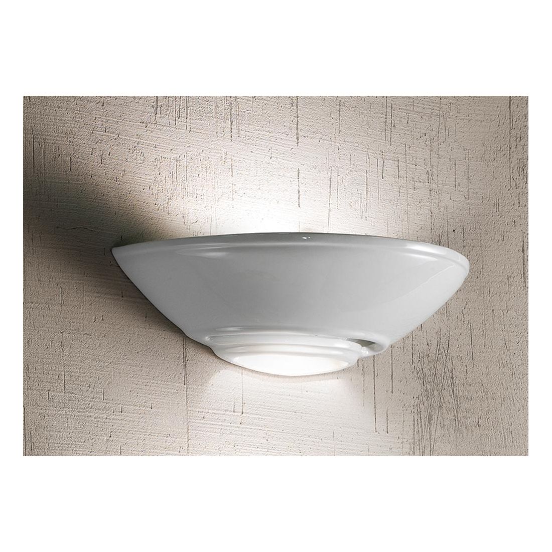 Applique da parete in stile classico realizzata in ceramica bianca lucida con una struttura a vaschetta orizzontale che presenta un foro nella parte inferiore che consente alla luce di fuoriuscire direttamente verso il basso e verso l'alto.