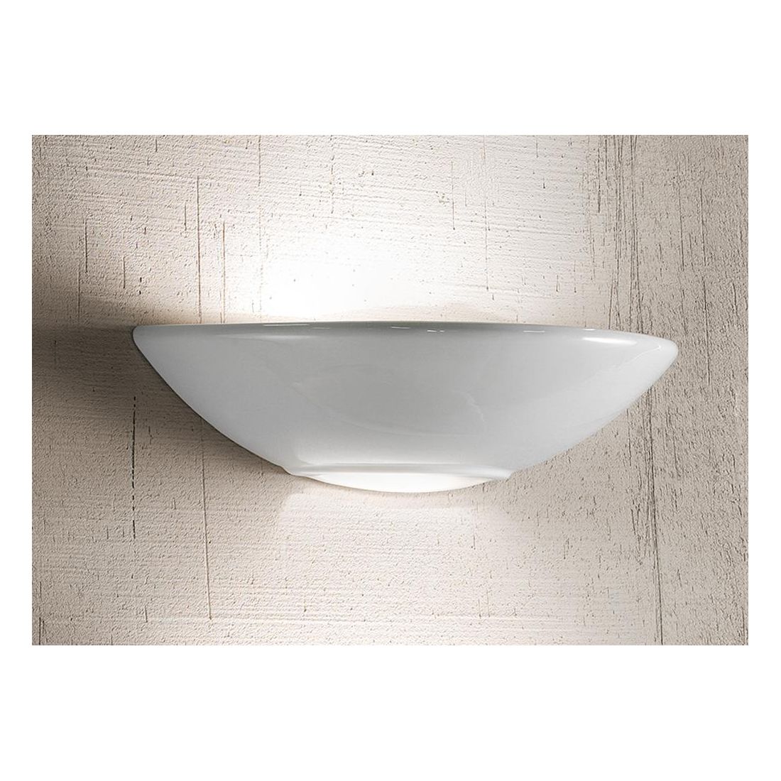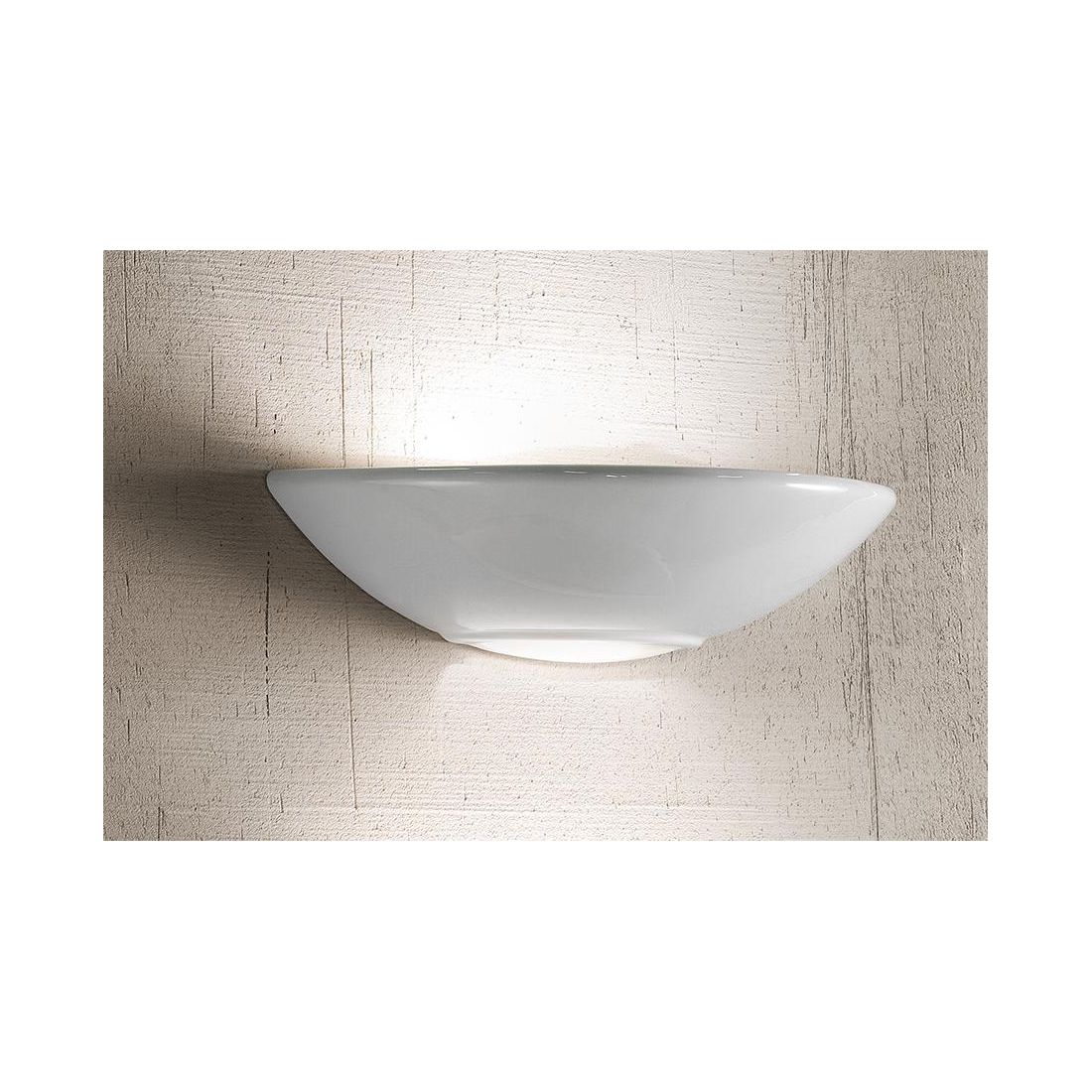 Applique da parete in stile classico realizzata in ceramica bianca lucida con una struttura a vaschetta orizzontale che presenta un foro nella parte inferiore che consente alla luce di fuoriuscire direttamente verso il basso e verso l'alto.