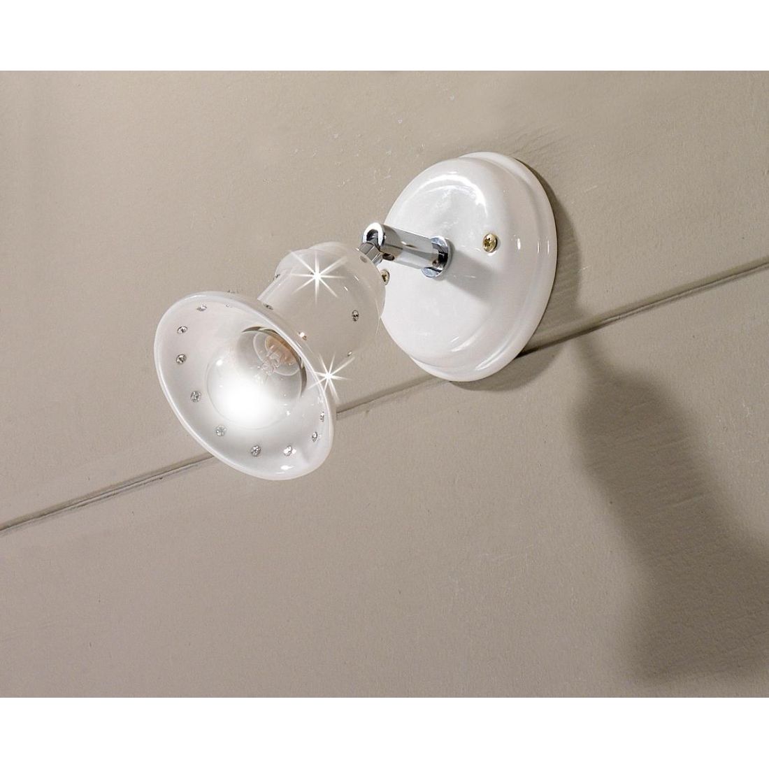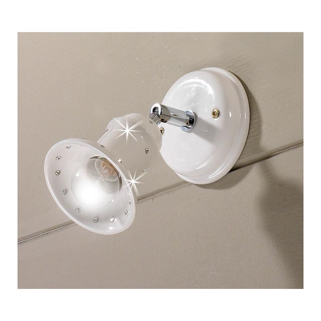 Piccola applique in stile classico che si presenta con una base rotonda realizzata interamente in ceramica bianca lucida così come il diffusore, che richiama la forma di una piccola campana, munito di snodo in metallo cromato utile per poter orientare la luce nel punto dove più vi necessita. La lampada viene impreziosita da piccoli cristalli applicati sul diffusore che brillano al momento dell'accensione.