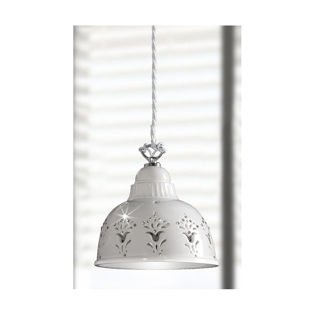Sospensione singola realizzata interamente in ceramica bianca lucida composta da rosone a soffitto e da diffusore, con diametro di cm 19, con simpatici motivi floreali intagliati e impreziosito da molteplici cristalli. Il lampadario viene rifinito con dettagli in metallo cromato sia a soffitto che sopra il piatto e con cavo a treccia di seta bianco.