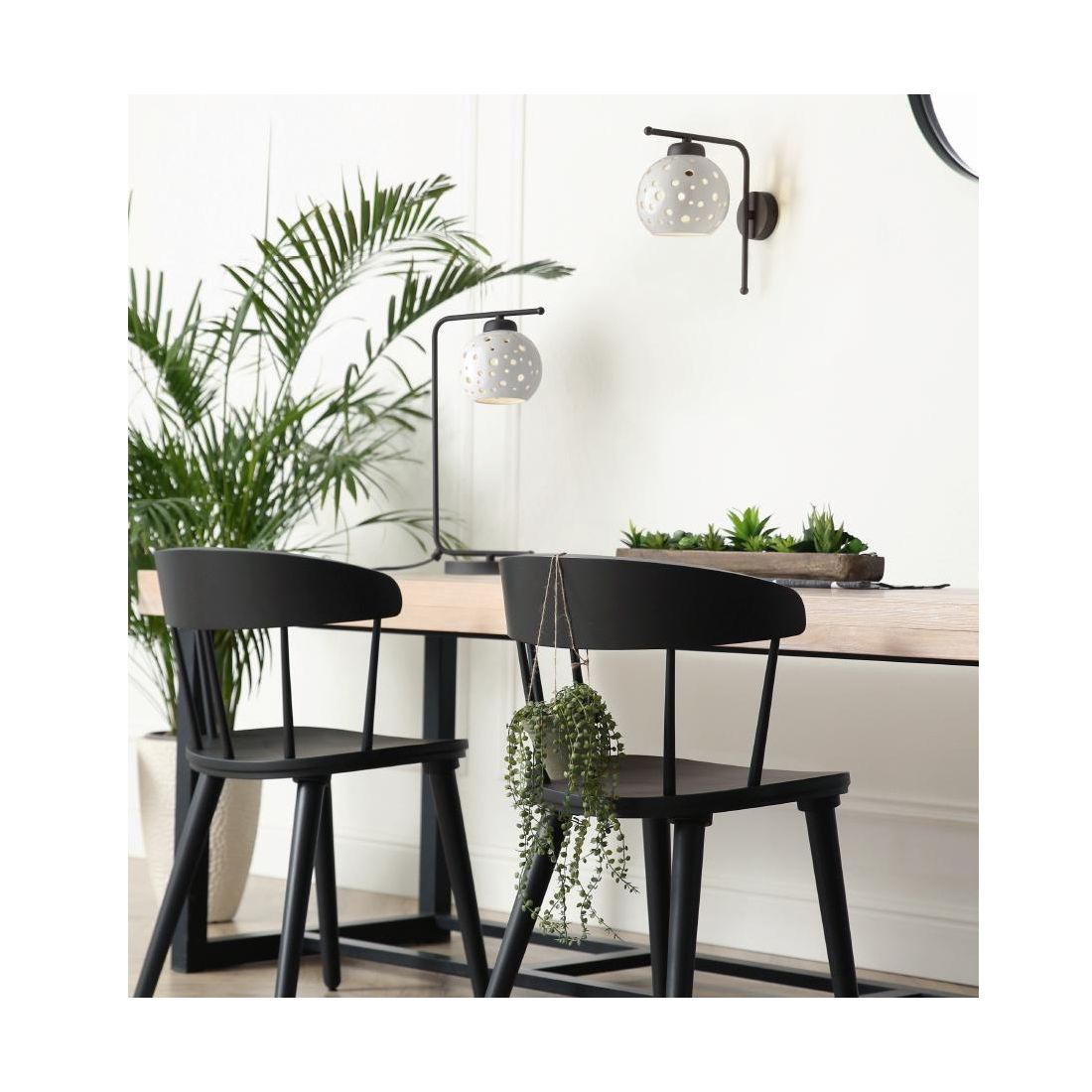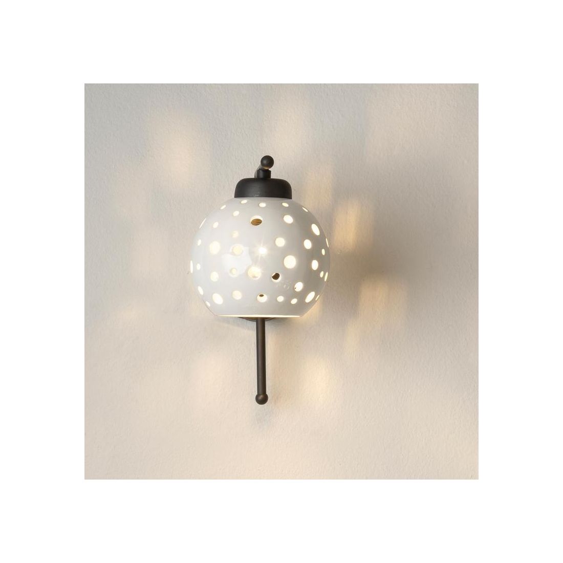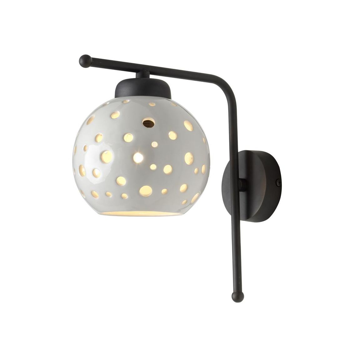 Lampada da parete dallo stile contemporaneo che si presenta con una struttura di colore nero e con un diffusore sferico in terracotta smaltata bianca, finemente traforato con fori di diverse dimensioni che generano affascinanti giochi di luce e ombra una volta accesa, creando un’atmosfera unica e accogliente.