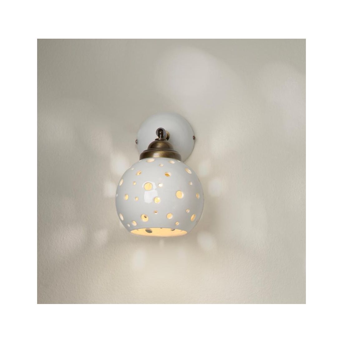 Piccola lampada da parete, dallo stile rustico, composta da base a muro a forma di coppetta e da diffusore sferico in terracotta smaltata bianca, impreziosito da una traforatura artistica realizzata con fori di diverse misure che creano un affascinante gioco di luci e ombre che si proietta sulle pareti generando un’atmosfera intima, calda e suggestiva ideale per ambienti che vogliono distinguersi per originalità e personalità.