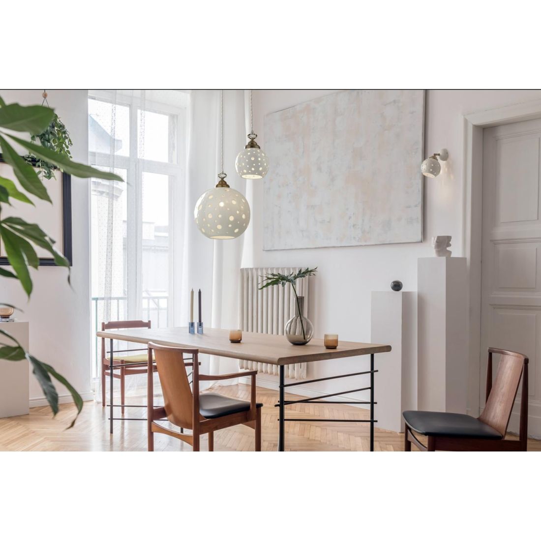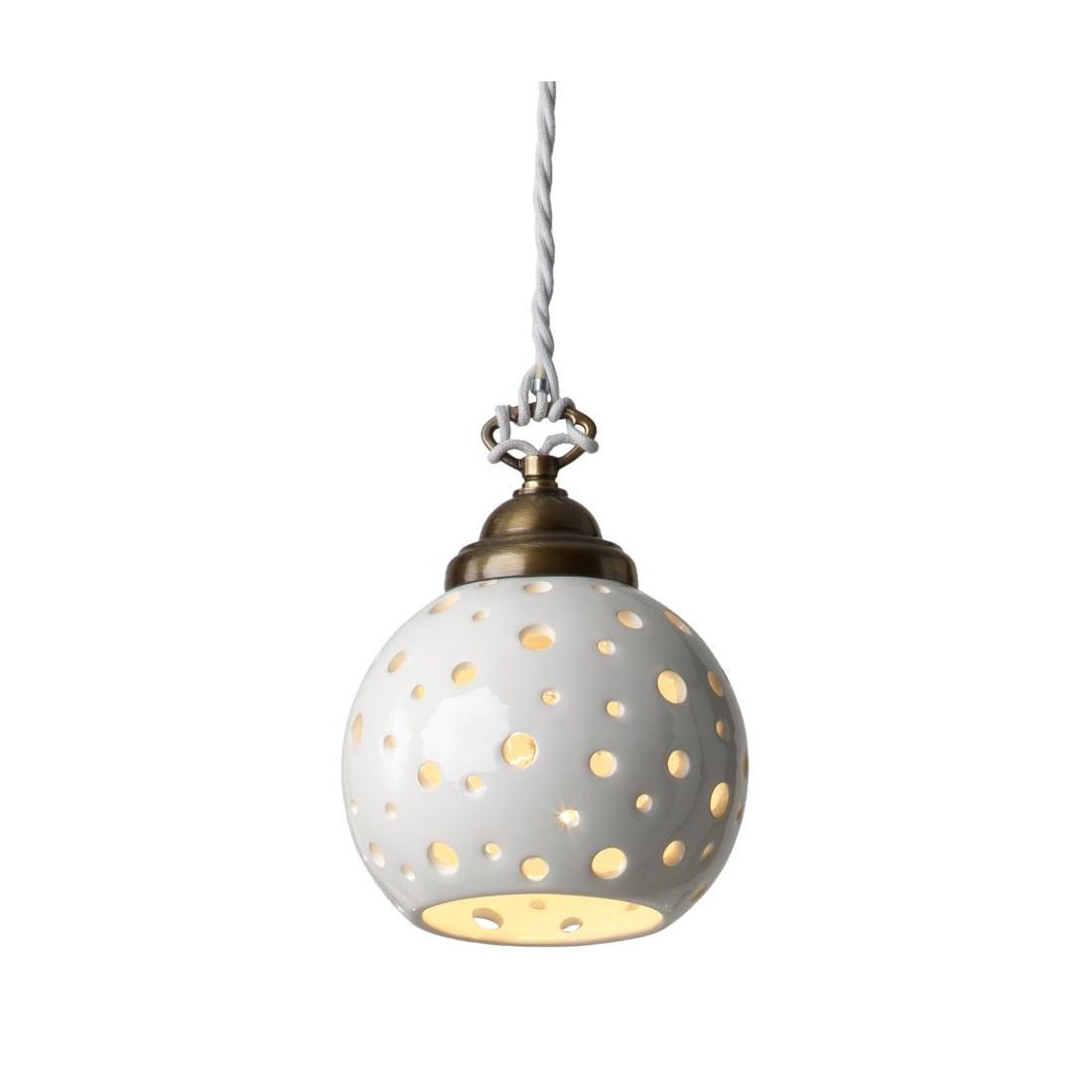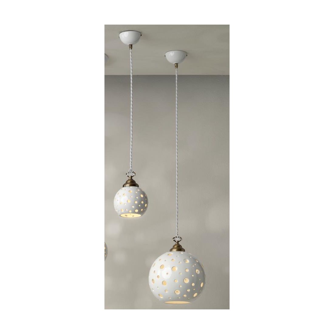 Sospensione singola dallo stile rustico composta da un rosone a soffitto a forma di coppetta in finitura bianca unito a un cavo a treccia, anch’esso bianco, regolabile in altezza per offrire la massima versatilità d’installazione. Il vero protagonista è il diffusore sferico in terracotta smaltata bianca, impreziosito da una traforatura artistica realizzata con fori di differenti dimensioni, che crea una suggestiva proiezione di luce e ombre sulle pareti e sul soffitto capace di trasformare l’atmosfera di qualsiasi ambiente in uno spazio caldo, accogliente e ricco di fascino.