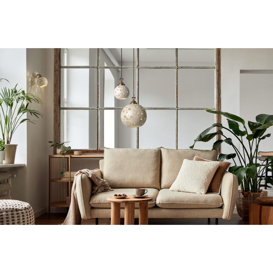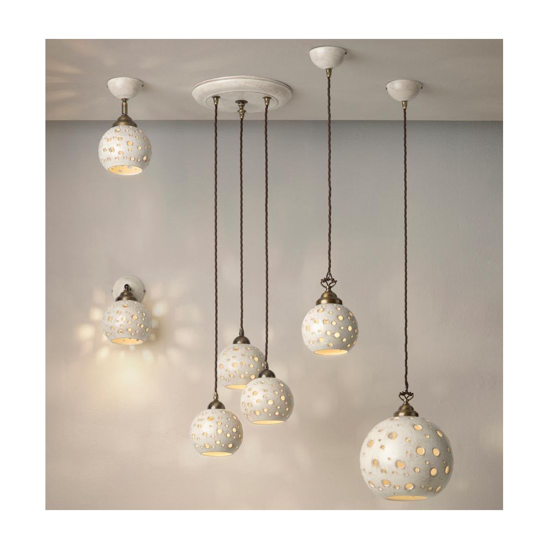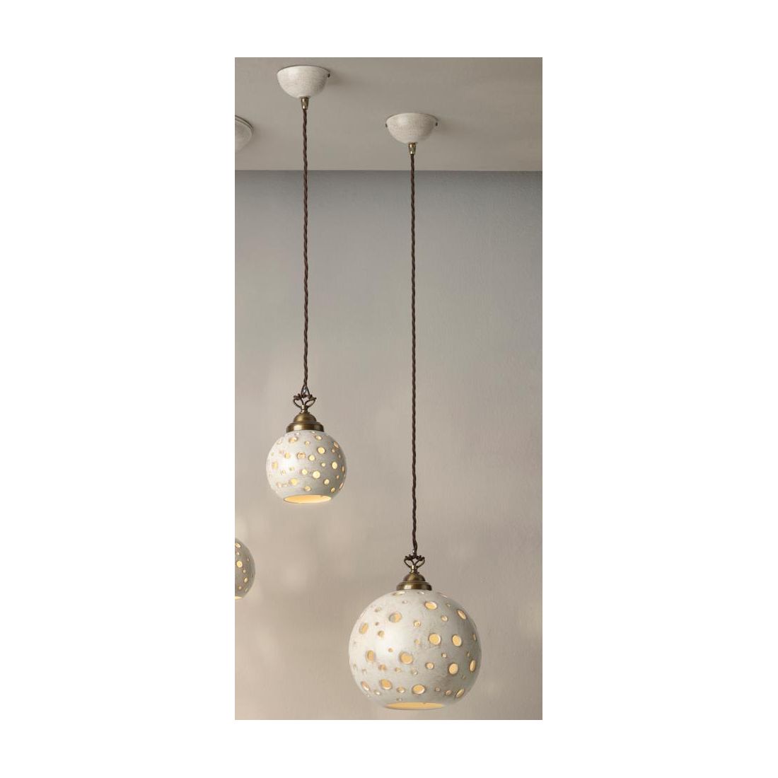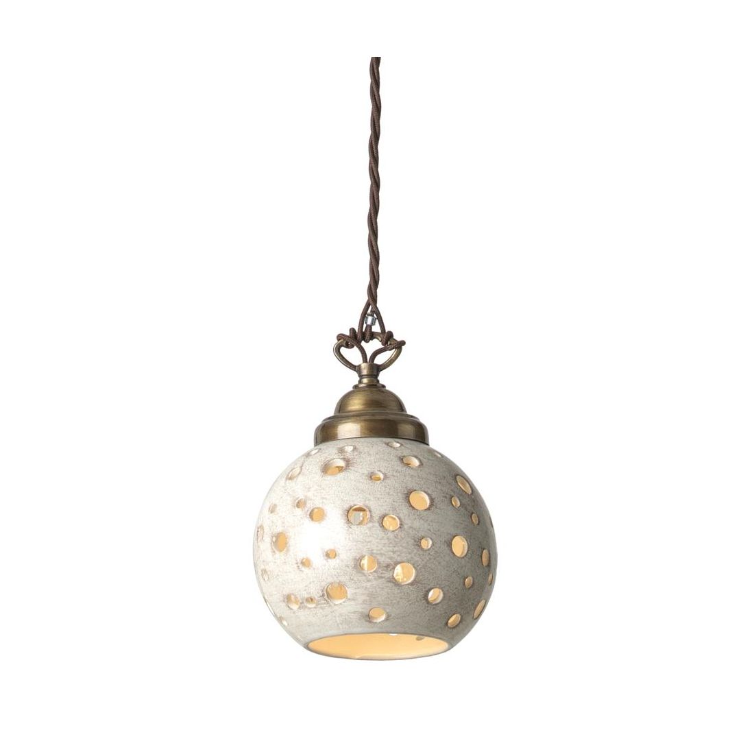 Sospensione singola, dallo stile rustico, Made in Italy, che si presenta con una montatura in metallo con finitura brunita, un rosone a soffitto a forma di coppetta e un diffusore sferico realizzati in terracotta con una finitura anticata. Il motivo traforato del diffusore, con fori di diametri variabili, crea un gioco di luci e ombre affascinante capace di trasformare l’ambiente in uno spazio intimo, caldo e accogliente, ideale per chi cerca un’illuminazione scenografica ma discreta.