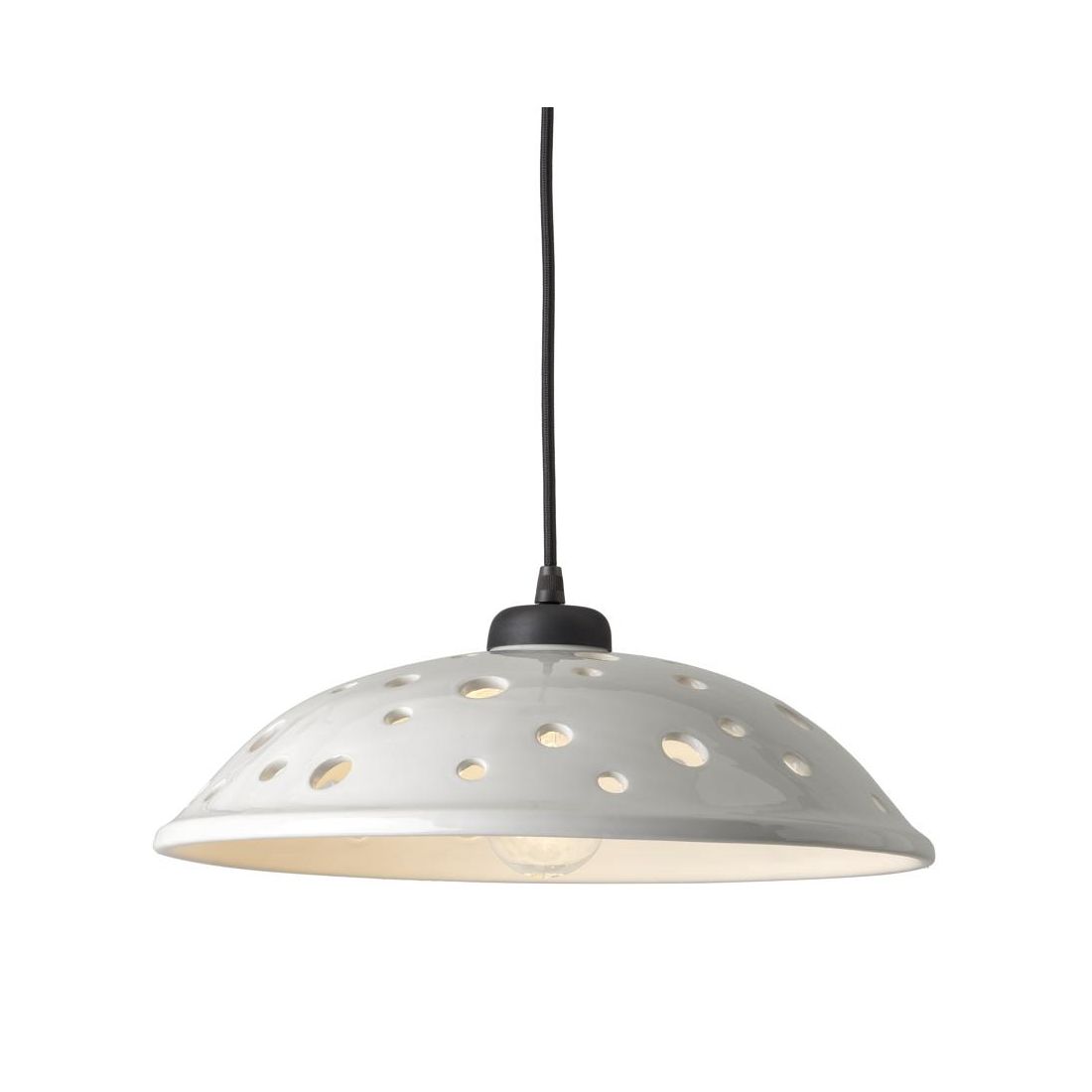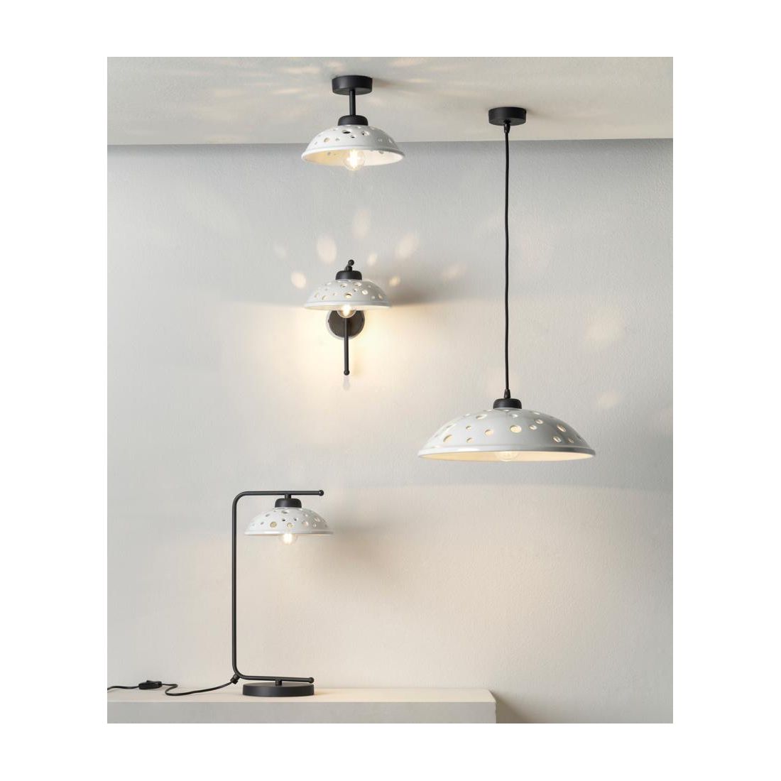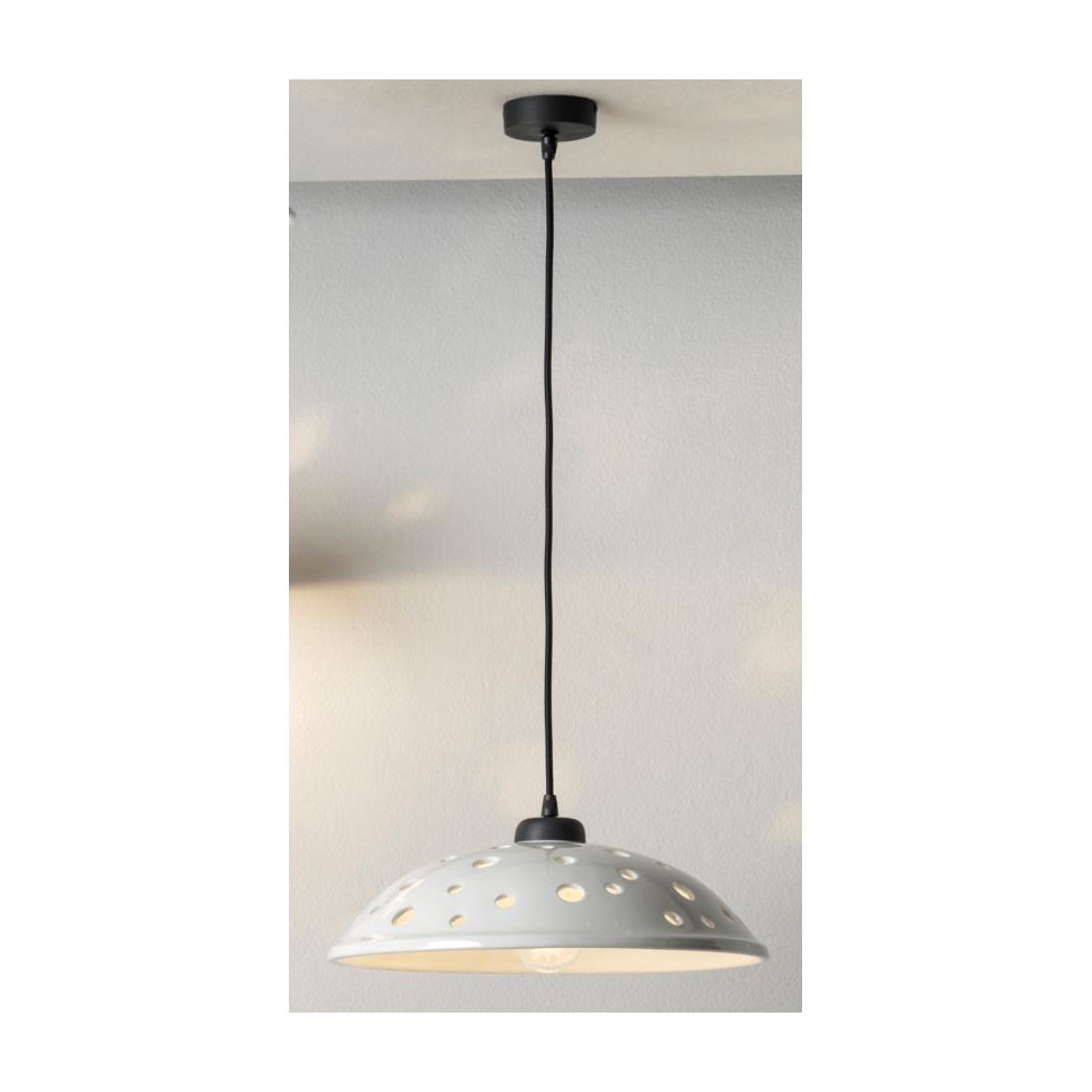 Sospensione singola, con stile contemporaneo, che si presenta con rosone rotondo a soffitto di colore nero e un ampio diffusore in terracotta smaltata lucida color bianco, modellato con cura artigianale, e caratterizzato da una traforatura artistica a fori irregolari. Una volta accesa, la lampada sprigiona un raffinato gioco di luce e ombra, capace di creare un’atmosfera calda, accogliente e visivamente coinvolgente.