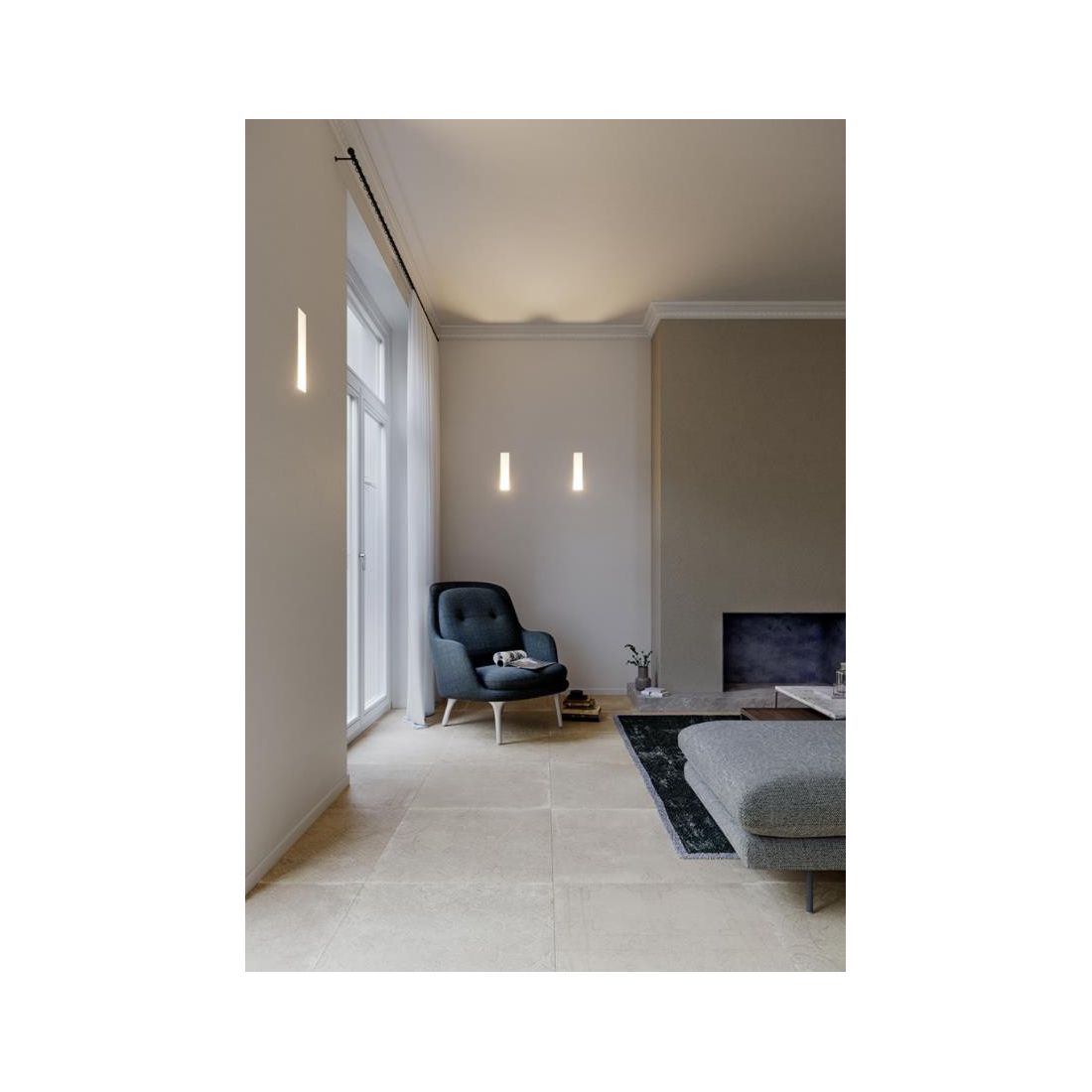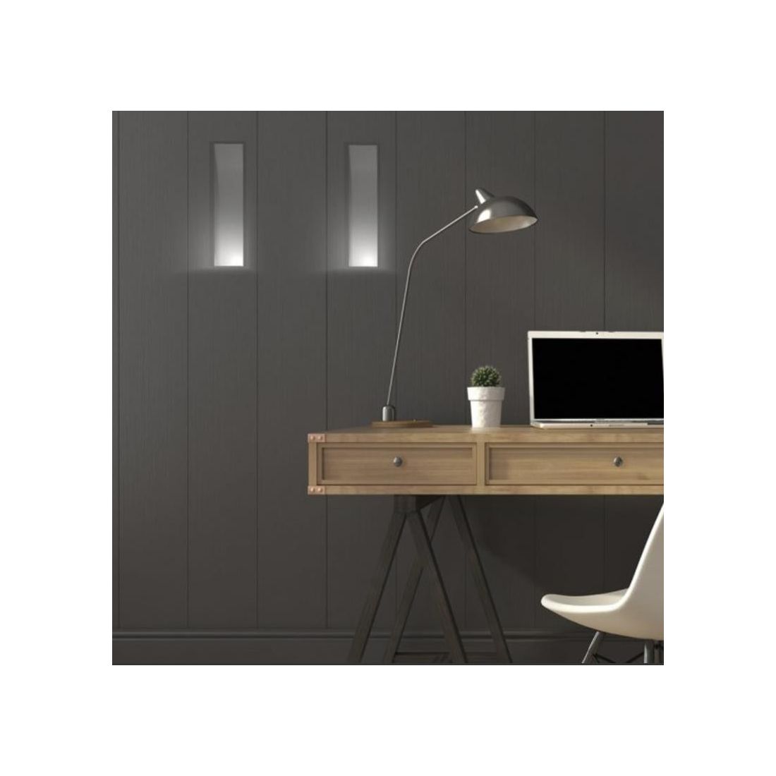 Incasso per pareti in cartongesso e in muratura realizzato in Cristaly, verniciabile a piacimento con un normalissimo colore di pittura, che si presenta come un incavo venrticale nella parete con un lato da cui fuoriesce la luce.