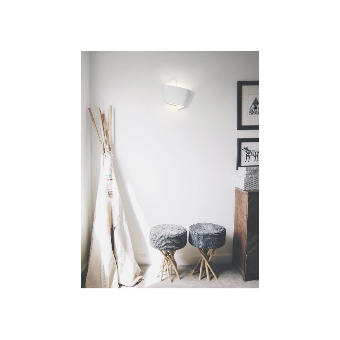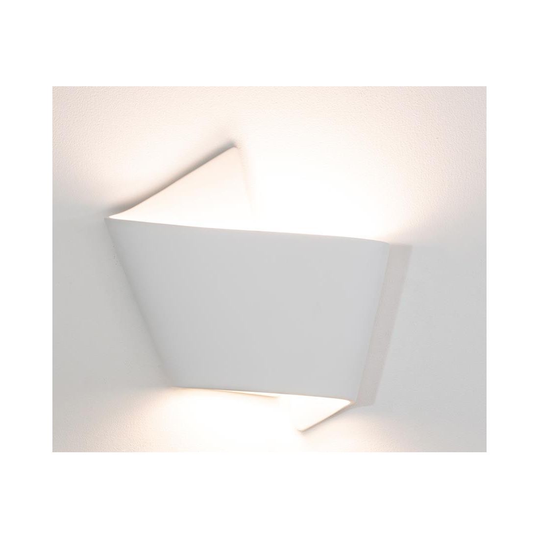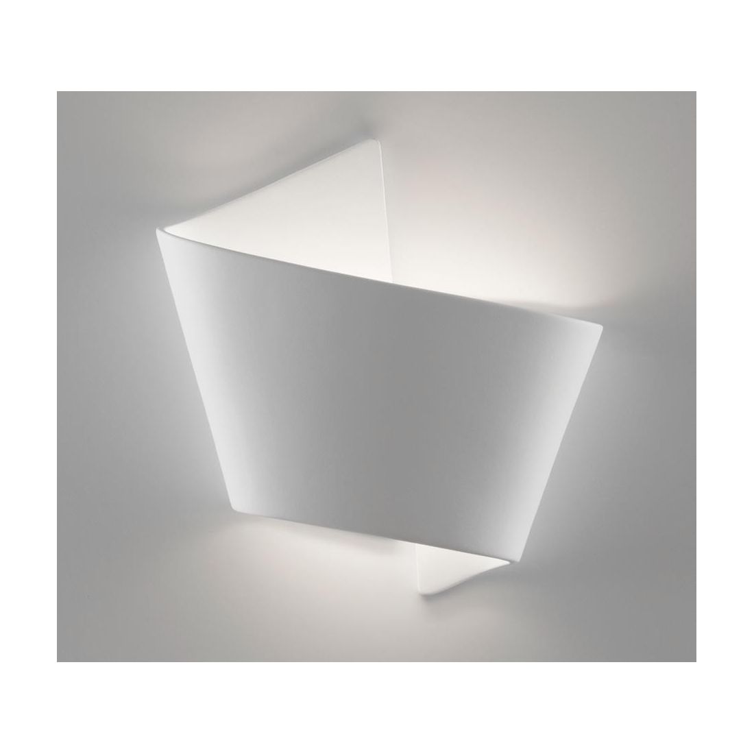 Applique da parete prodotta in Italia dalla Belfiore 9010, realizzata in ceramica effetto gesso, verniciabile a piacimento con un normalissimo colore di pittura che si presenta con una struttura sinuosa ed innovativa, che ricorda un pezzo di parete sporgente con due angoli che creano un'armoniosa simmetria, con fuoriuscita della luce sia dalla parte superiore sia da quella inferiore.