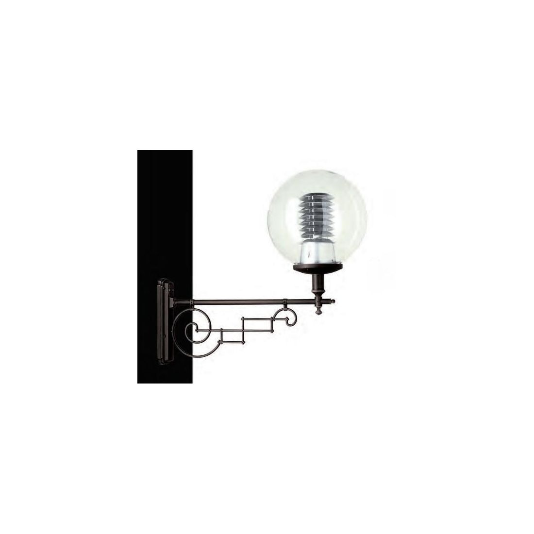 Lampada da parete ideata per ambienti esterni, prodotto 100% Made in Italy, che si presenta con una struttura a braccio in alluminio pressofuso verniciato a polveri in forno, disponibile nei colori Antracite oppure Nero (a vostra scelta) e con il diffusore a sfera, rivolto verso l'alto, prodotto in vetro trasparente.