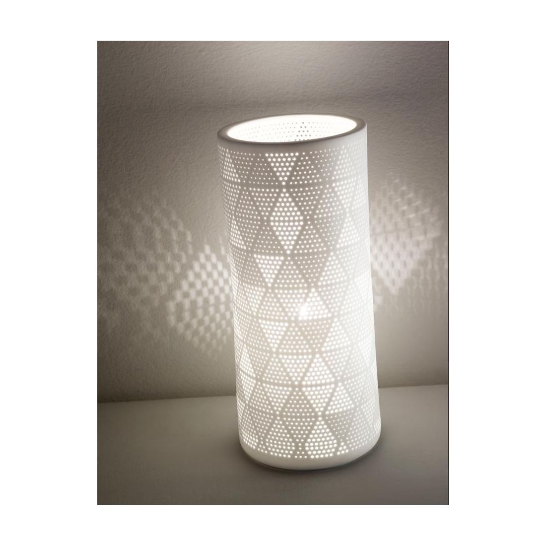 Lampada da tavolo o abat-jour dal design moderno con il diffusore in ceramica bianca con una lavorazione composta da piccoli fori grazie ai quali, una volta accesa la lampada, si creano dei divertenti giochi di luce sulle pareti.