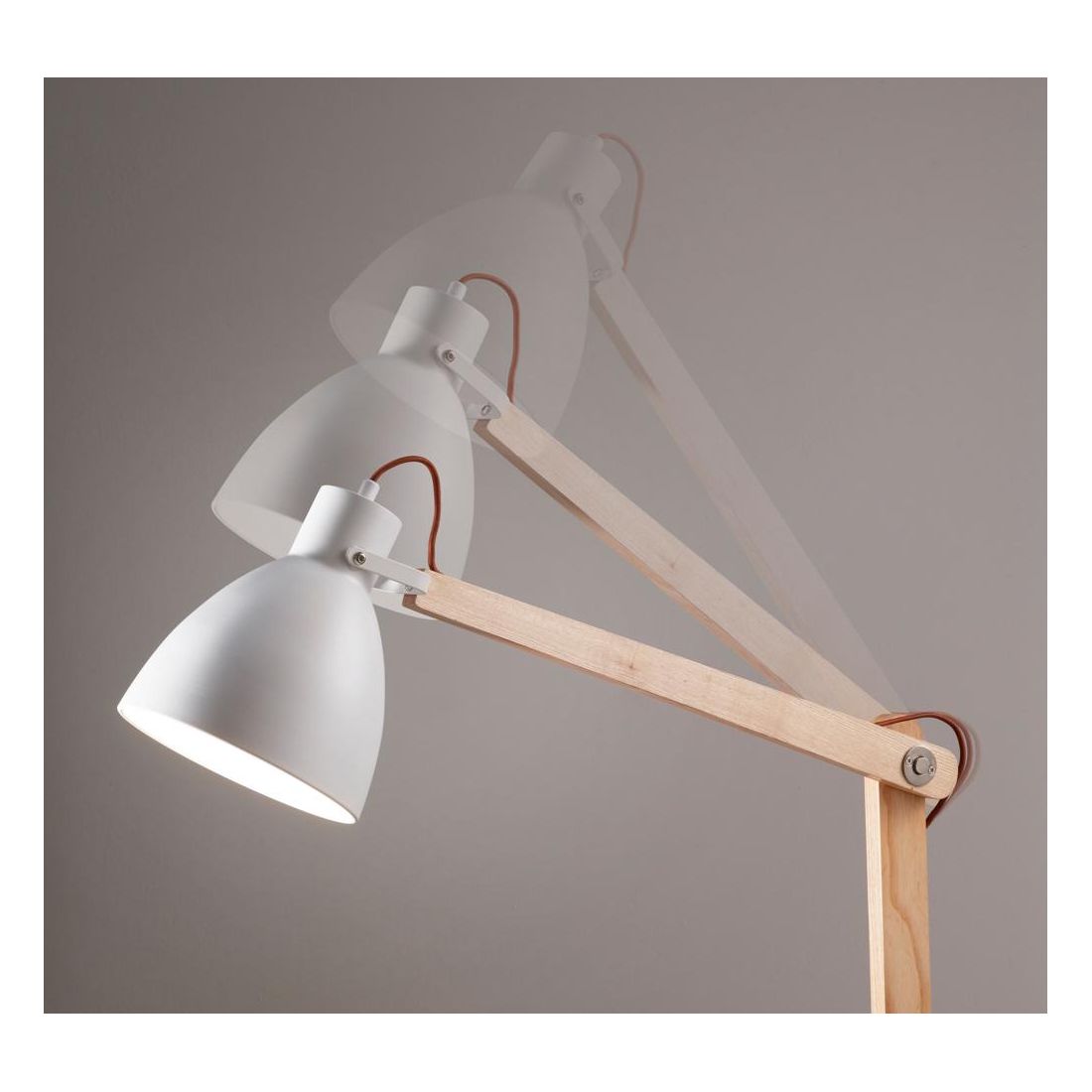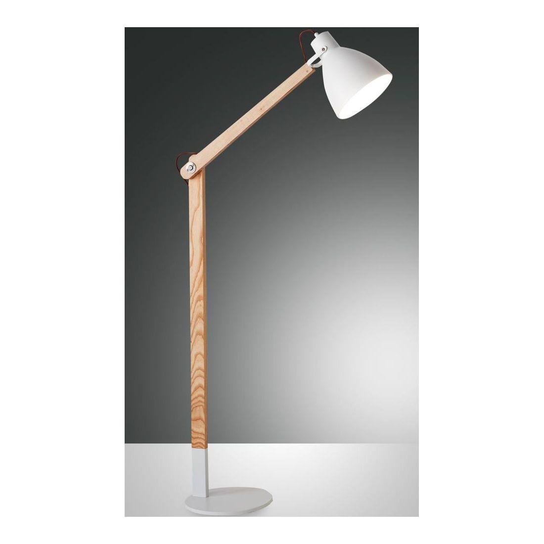 Lampada da tavolo composta da una base rotonda in metallo verniciato, dallo stelo in legno snodato e quindi orientabile, color Noce oppure Frassino, e dal diffusore sempre in metallo verniciato, Nero oppure Bianco, che è anch'esso orientabile grazie alla maniglia posta all'estremità del braccio.