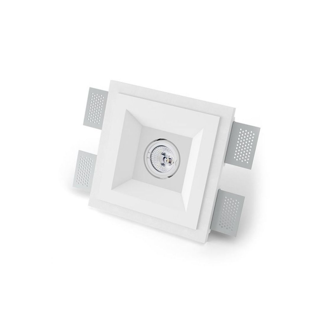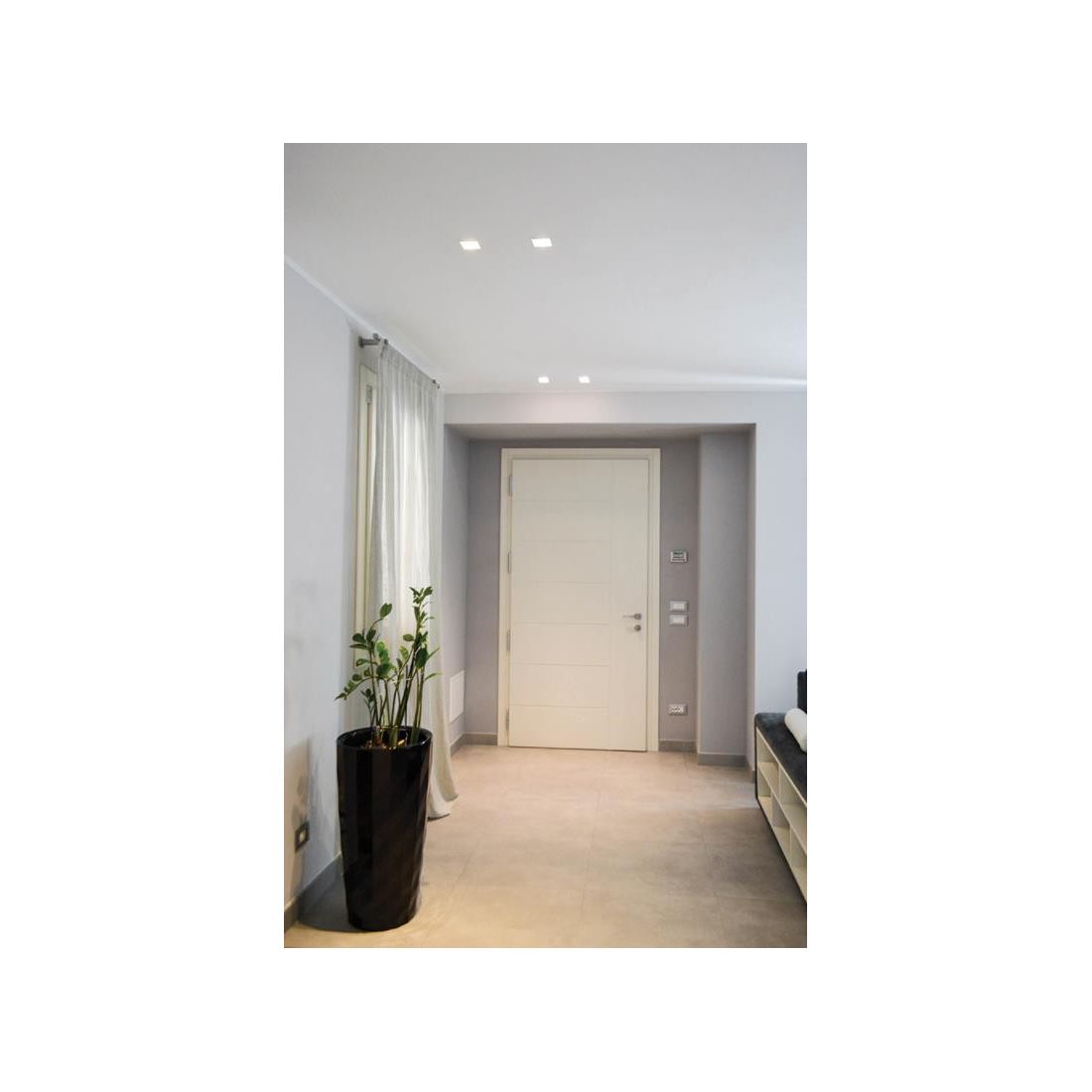 Incasso a plafone realizzato in Cristaly *, verniciabile a piacimento con un normalissimo colore di pittura, che si presenta con la lampadina posizionata leggermente in profondità rispetto alla parete in una forma quadrata.