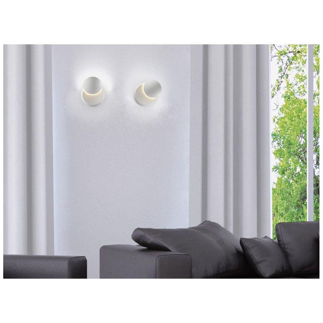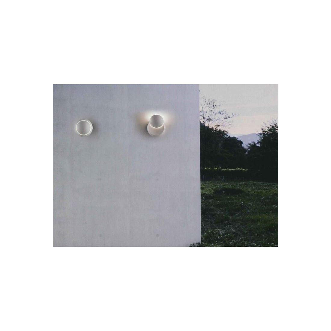 Lampada da parete per uso interno ed esterno che si presenta con un corpo in alluminio verniciato in bianco opaco e schermo in materiale plastico. E' dotata di testa girevole che, ruotando sull'asse orizzontale, permette di creare effetti di luce personalizzati sulle pareti.