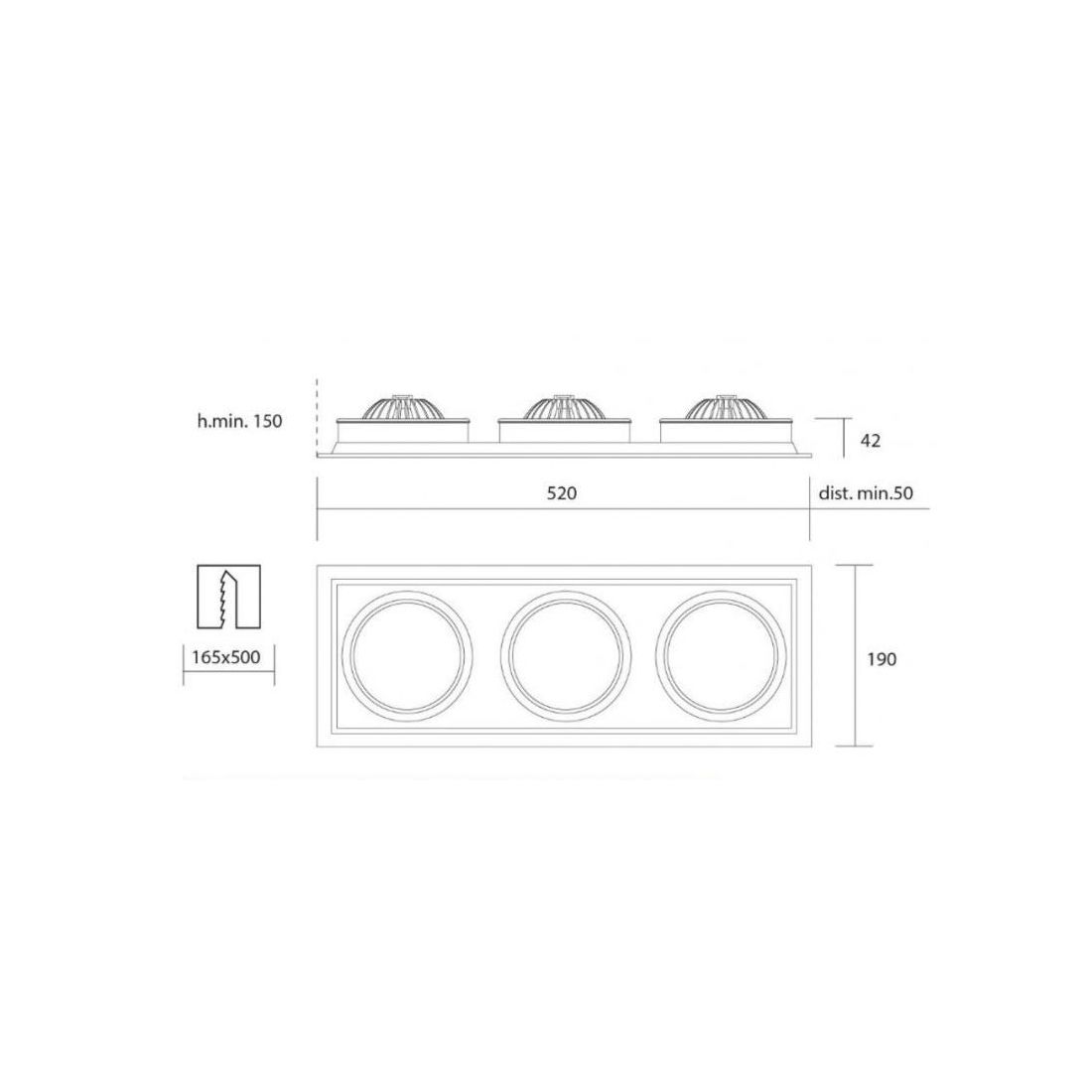 Faretto da incasso orientabile a tre luci, della Isyluce, che viene realizzato in laminato metallico bianco satinato per controsoffitto adatto per ambienti interni; la struttura è rettangolare con molle in metallo incorporate per facilitarne l’installazione nel cartongesso da mm 9 a mm 25.