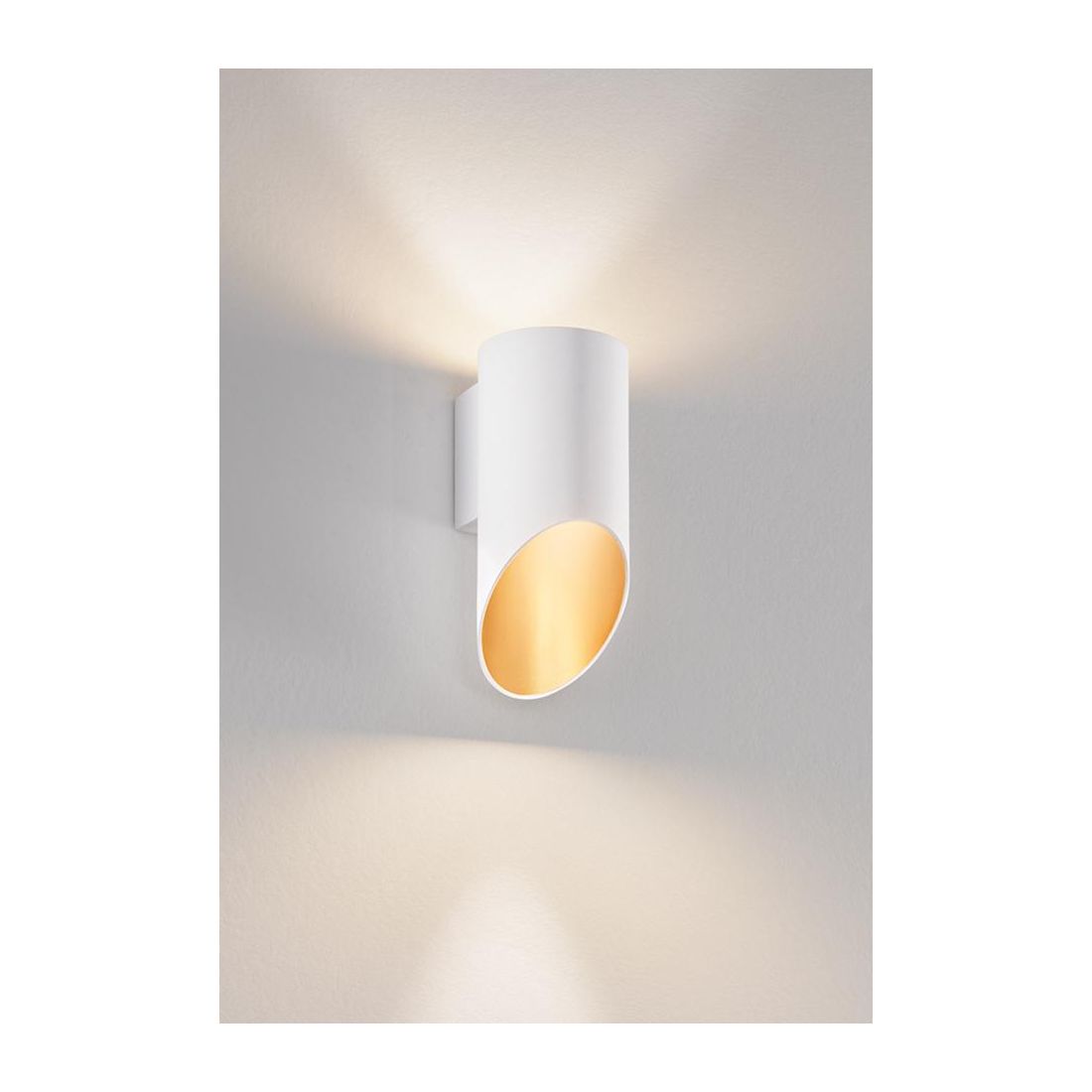 Applique con un design moderno e originale, composto da base a muro e dal diffusore realizzato in alluminio con finitura, a scelta, tra Bianco o Nero, con l'interno verniciato in Oro; una lampada, dal design semplice, che emette un fascio di luce rivolto verso l'alto e uno rivolto verso il basso; perfetto in qualsiasi ambiente come la camera da letto, la cucina, il soggiorno, lo studio, il corridoio e l'ingresso di casa.